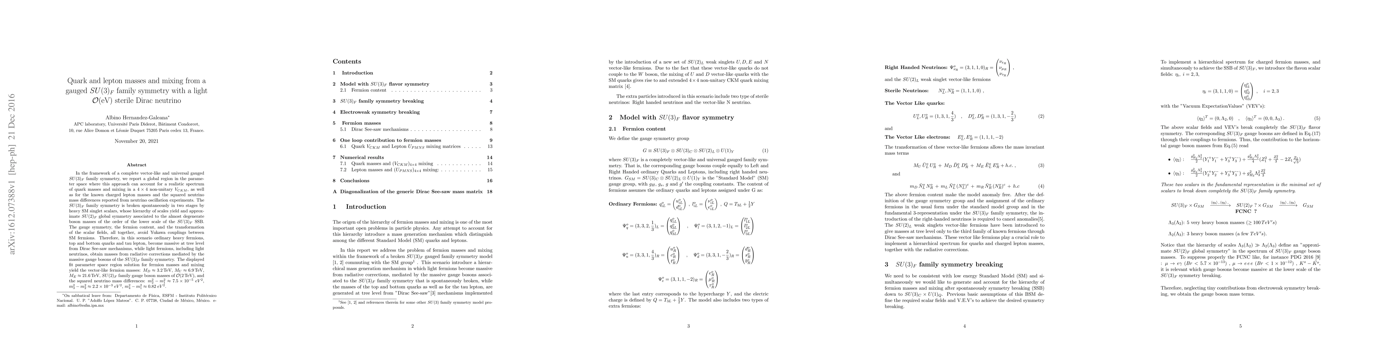 This paper explores a gauged SU(3)_F family symmetry framework that explains quark and lepton masses and mixing, including a light sterile Dirac neutrino. The model avoids direct Yukawa couplings, generating masses via Dirac See-saw mechanisms and radiative corrections, fitting the observed mass spectrum and neutrino oscillation parameters.