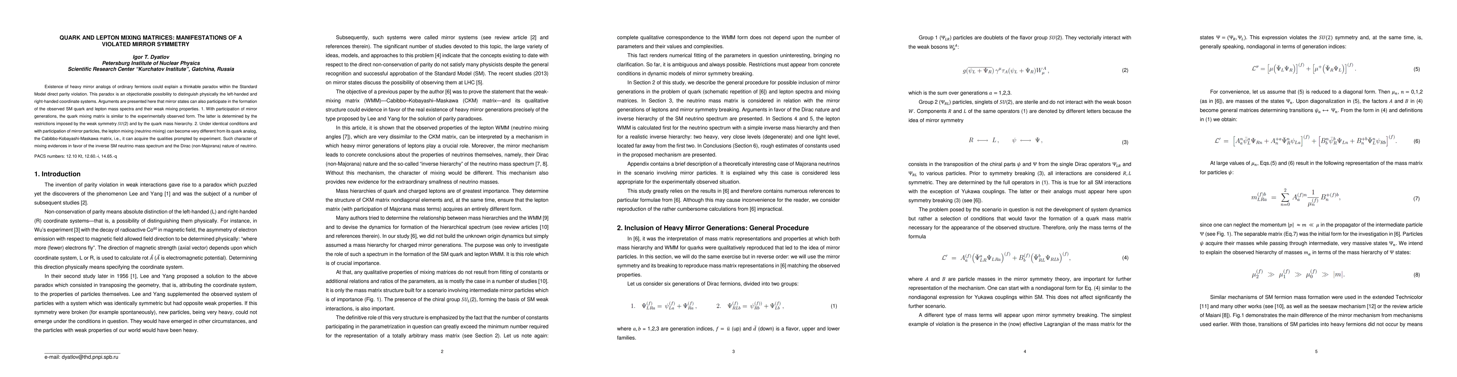 This paper explores how the existence of heavy mirror fermions could resolve the paradox of direct parity violation in the Standard Model, suggesting that mirror states contribute to the formation of quark and lepton mass spectra and their mixing properties. The quark mixing matrix aligns with experimental observations due to mirror generations, while the lepton mixing differs significantly, supporting an inverse neutrino mass spectrum and a Dirac nature.