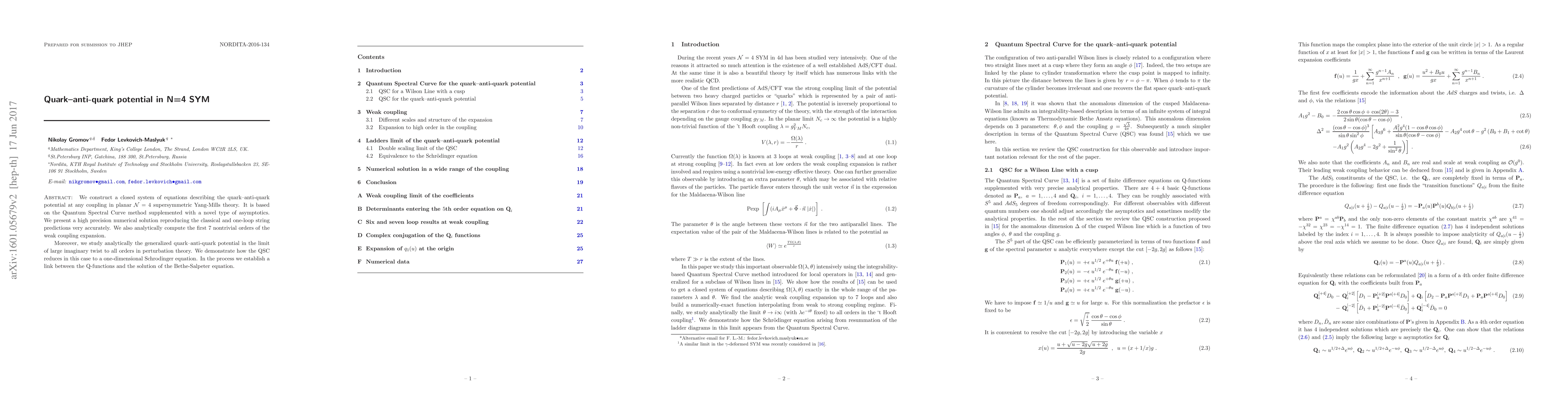 We construct a closed system of equations describing the quark--anti-quark potential at any coupling in planar N=4 supersymmetric Yang-Mills theory. It is based on the Quantum Spectral Curve method supplemented with a novel type of asymptotics. We present a high precision numerical solution reproducing the classical and one-loop string predictions very accurately. We also analytically compute the first 7 nontrivial orders of the weak coupling expansion. Moreover, we study analytically the generalized quark--anti-quark potential in the limit of large imaginary twist to all orders in perturbation theory. We demonstrate how the QSC reduces in this case to a one-dimensional Schrodinger equation. In the process we establish a link between the Q-functions and the solution of the Bethe-Salpeter equation.