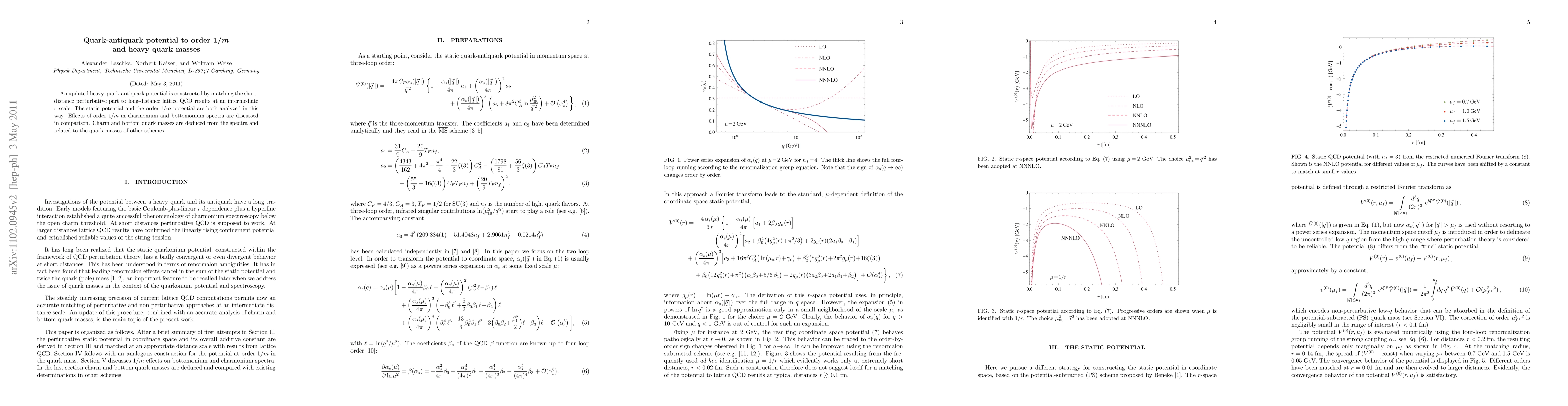 An updated heavy quark-antiquark potential is constructed by matching the short-distance perturbative part to long-distance lattice QCD results at an intermediate r scale. The static potential and the order 1/m potential are both analyzed in this way. Effects if order 1/m in charmonium and bottomonium spectra are discussed in comparison. Charm and bottom quark masses are deduced from the spectra and related to the quark masses of other schemes.