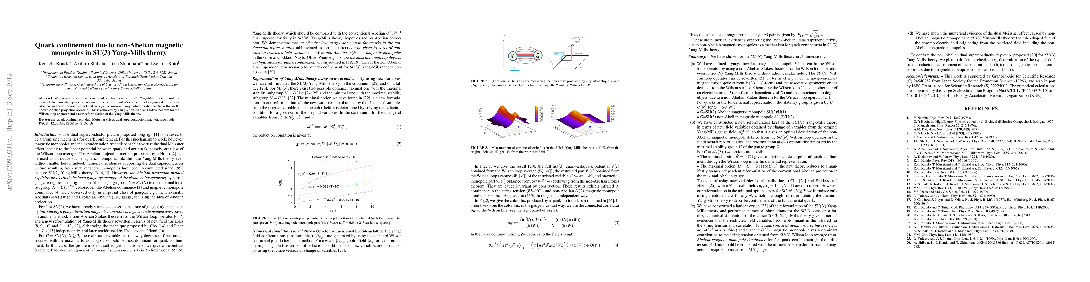 We present recent results on quark confinement: in SU(3) Yang-Mills theory, confinement of fundamental quarks is obtained due to the dual Meissner effect originated from non-Abelian magnetic monopoles defined in a gauge-invariant way, which is distinct from the well-known Abelian projection scenario. This is achieved by using a non-Abelian Stokes theorem for the Wilson loop operator and a new reformulation of the Yang-Mills theory.