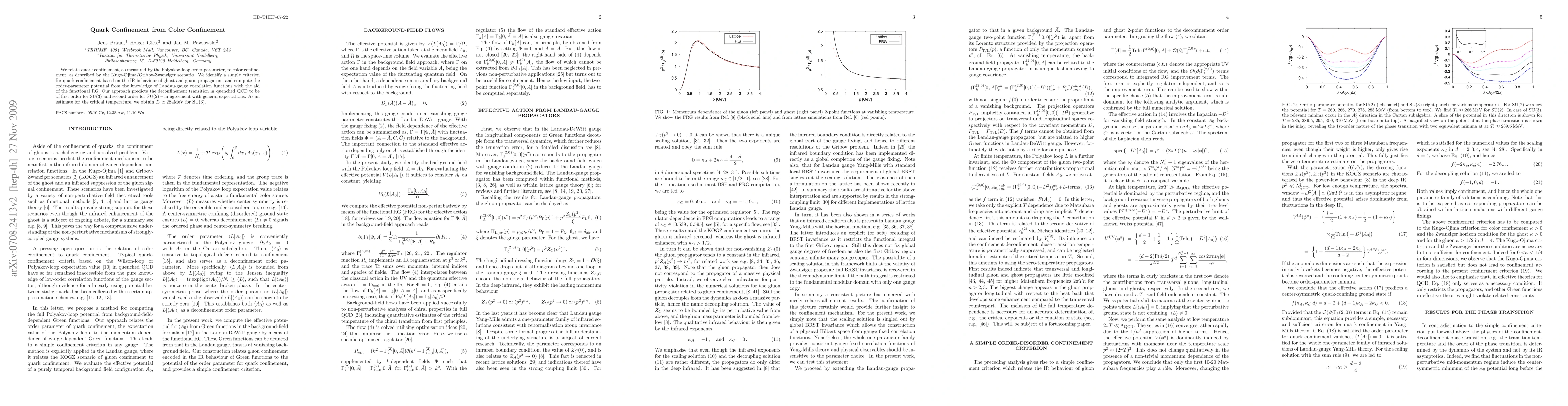 We relate quark confinement, as measured by the Polyakov-loop order parameter, to color confinement, as described by the Kugo-Ojima/Gribov-Zwanziger scenario. We identify a simple criterion for quark confinement based on the IR behaviour of ghost and gluon propagators, and compute the order-parameter potential from the knowledge of Landau-gauge correlation functions with the aid of the functional RG. Our approach predicts the deconfinement transition in quenched QCD to be of first order for SU(3) and second order for SU(2) -- in agreement with general expectations. As an estimate for the critical temperature, we obtain T_c=284MeV for SU(3).