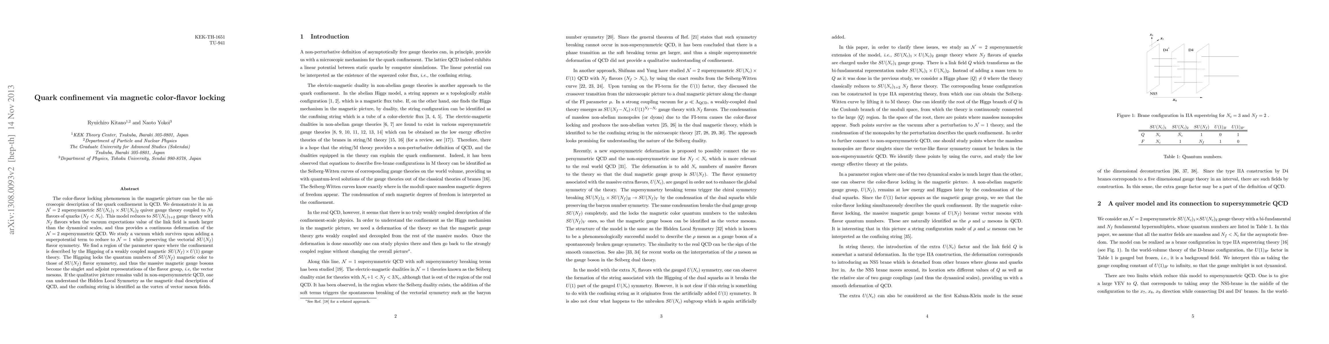 This paper explores quark confinement in QCD through the color-flavor locking phenomenon in a supersymmetric gauge theory. It finds that confinement arises from the Higgsing of a magnetic gauge theory, locking magnetic color and flavor symmetries, which manifests as vector mesons.