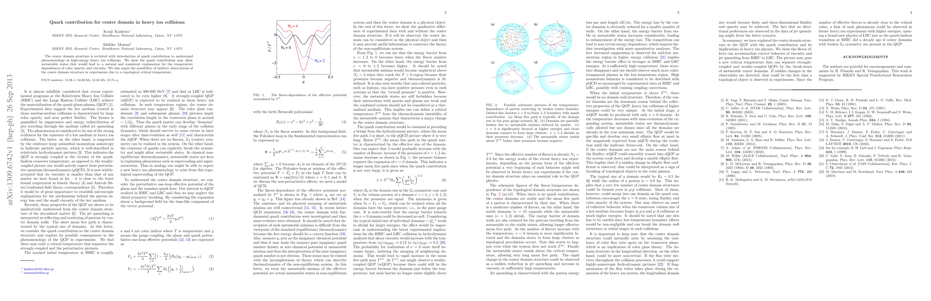 The center domain structure is revisited with introduction of quark contribution to understand phenomenology in high-energy heavy ion collisions. We show the quark contribution may allow metastable states that would lead to a natural and consistent explanation for the temperature dependences of color opacity and viscosity. We also argue the possibility of indirect observations of the center domain structure in experiments due to a topological critical temperature.