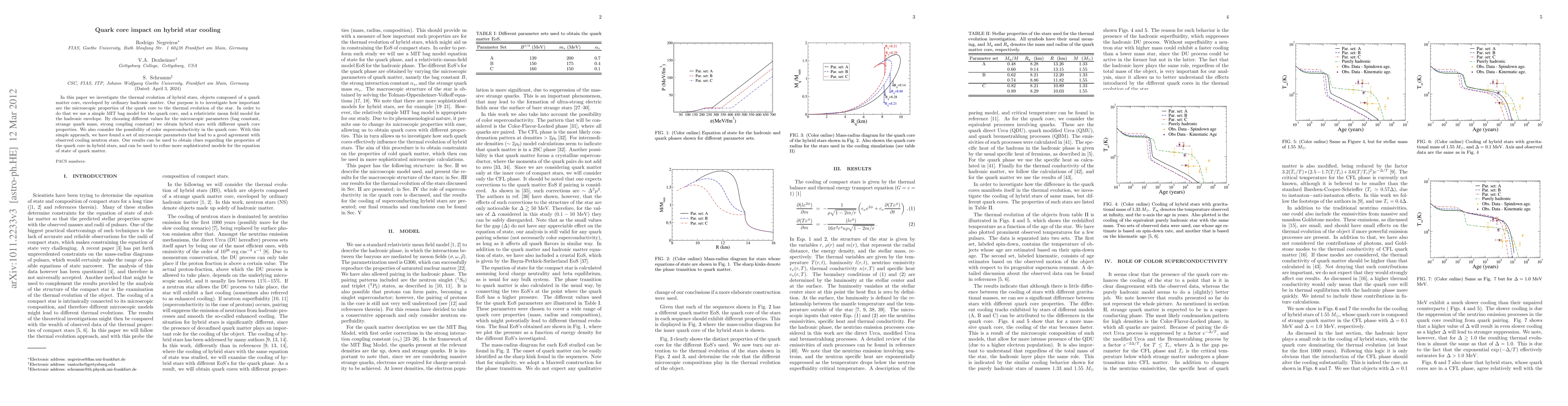 In this paper we investigate the thermal evolution of hybrid stars, objects composed of a quark matter core, enveloped by ordinary hadronic matter. Our purpose is to investigate how important are the microscopic properties of the quark core to the thermal evolution of the star. In order to do that we use a simple MIT bag model for the quark core, and a relativistic mean field model for the hadronic envelope. By choosing different values for the microscopic parameters (bag constant, strange quark mass, strong coupling constant) we obtain hybrid stars with different quark core properties. We also consider the possibility of color superconductivity in the quark core. With this simple approach, we have found a set of microscopic parameters that lead to a good agreement with observed cooling neutron stars. Our results can be used to obtain clues regarding the properties of the quark core in hybrid stars, and can be used to refine more sophisticated models for the equation of state of quark matter.