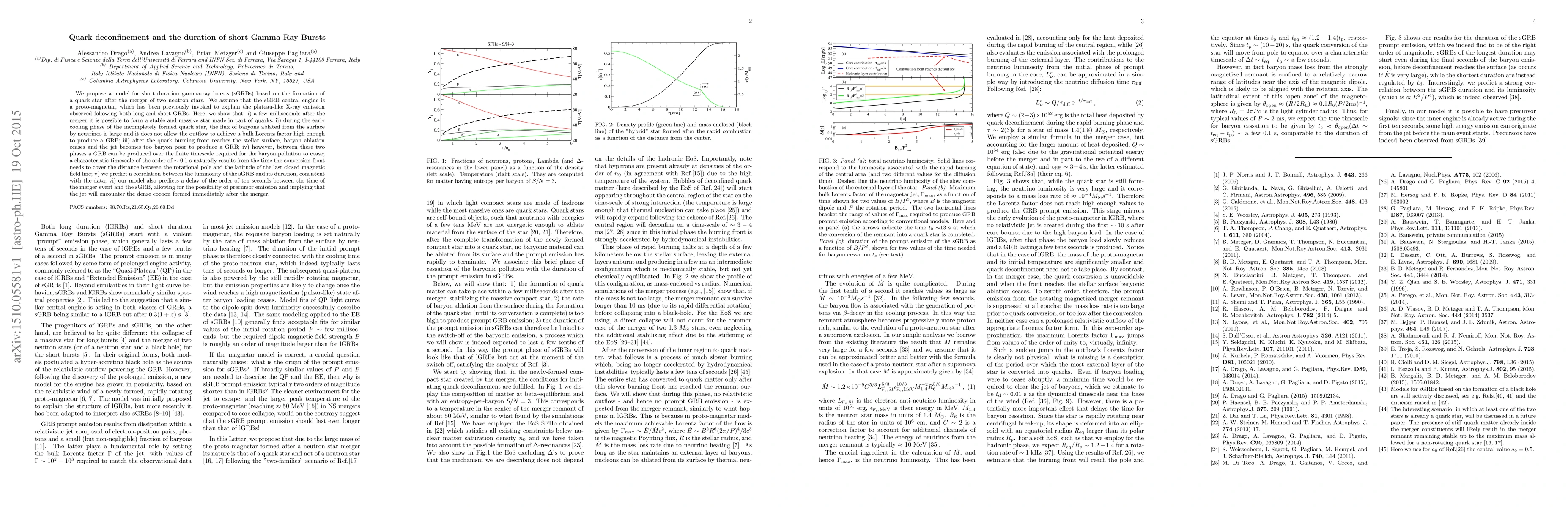The paper proposes a model for short Gamma Ray Bursts (sGRBs) originating from quark star formation post neutron star merger. It suggests sGRBs occur during the transition phase when a jet becomes less baryon-loaded, predicting a luminosity-duration correlation and a delay of ~10 seconds between merger and sGRB.