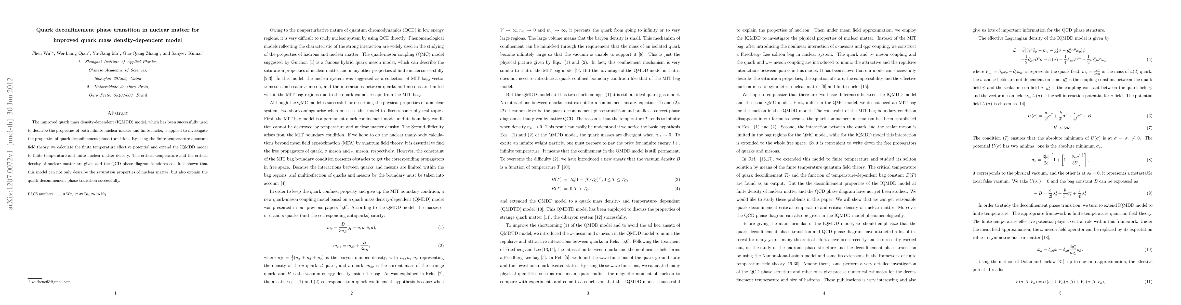 The IQMDD model is applied to study the quark deconfinement phase transition, revealing critical temperature and density for nuclear matter. The model successfully explains the transition and saturation properties of nuclear matter within a QCD phase diagram.