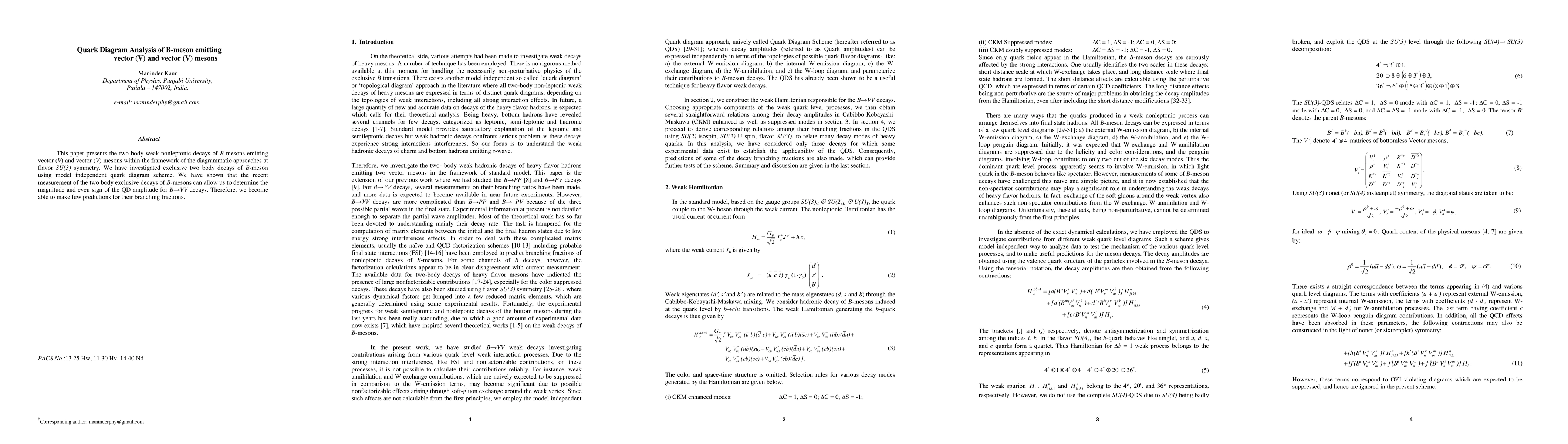 This paper presents the two body weak nonleptonic decays of B-mesons emitting vector (V) and vector (V) mesons within the framework of the diagrammatic approaches at flavor SU(3) symmetry. We have investigated exclusive two body decays of B-meson using model independent quark diagram scheme. We have shown that the recent measurement of the two body exclusive decays of B-mesons can allow us to determine the magnitude and even sign of the QD amplitude for B VV decays. Therefore, we become able to make few predictions for their branching fractions.
