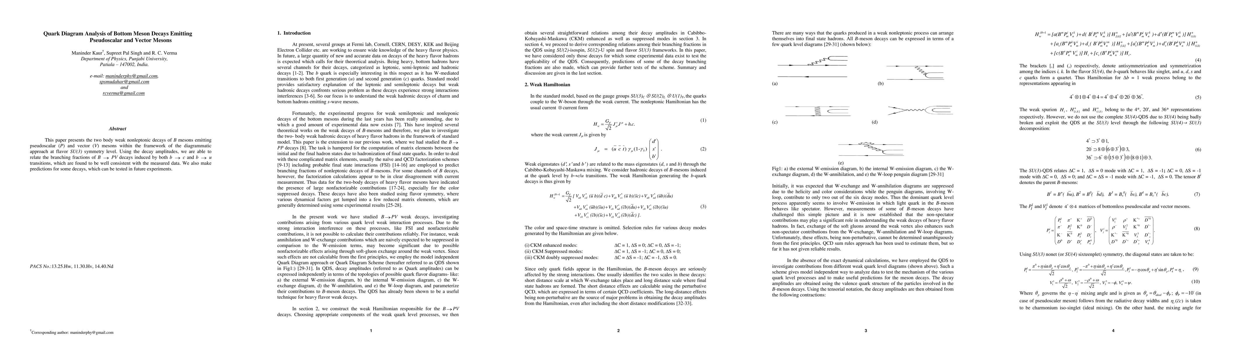 This paper analyzes the two-body weak nonleptonic decays of B mesons into pseudoscalar and vector mesons using a diagrammatic approach at the SU(3) flavor symmetry level, finding consistency with measured data and predicting new decay outcomes for future experimental validation.