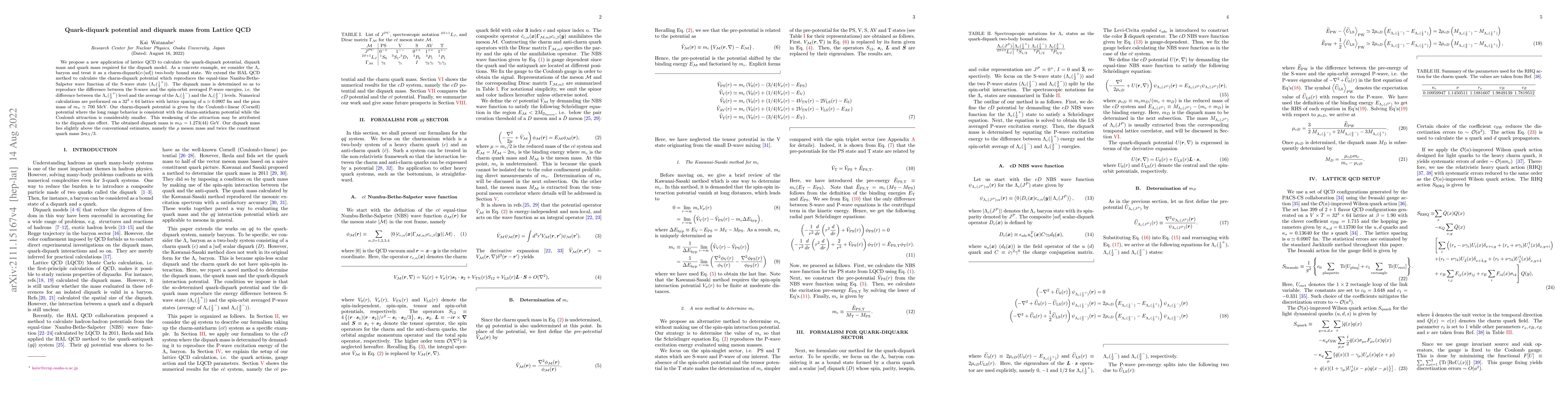 We propose a new application of lattice QCD to calculate the quark-diquark potential, diquark mass and quark mass required for the diquark model. As a concrete example, we consider the $\Lambda_c$ baryon and treat it as a charm-diquark($c$-[$ud$]) two-body bound state. We extend the HAL QCD method to calculate the charm-diquark potential which reproduces the equal-time Nambu-Bethe-Salpeter wave function of the S-wave state ($\Lambda_c(\frac12^+)$). The diquark mass is determined so as to reproduce the difference between the S-wave and the spin-orbit averaged P-wave energies, i.e. the difference between the $\Lambda_c(\frac12^+)$ level and the average of the $\Lambda_c(\frac12^-)$ and the $\Lambda_c(\frac32^-)$ levels. Numerical calculations are performed on a $32^3\times 64$ lattice with lattice spacing of $a \simeq 0.0907$ fm and the pion mass of $m_{\pi} \simeq 700$ MeV. Our charm-diquark potential is given by the Coulomb+linear (Cornell) potential where the long range behavior is consistent with the charm-anticharm potential while the Coulomb attraction is considerably smaller. This weakening of the attraction may be attributed to the diquark size effect. The obtained diquark mass is $m_D=1.273(44)$ GeV. Our diquark mass lies slightly above the conventional estimates, namely the $\rho$ meson mass and twice the constituent quark mass $2m_N/3$.