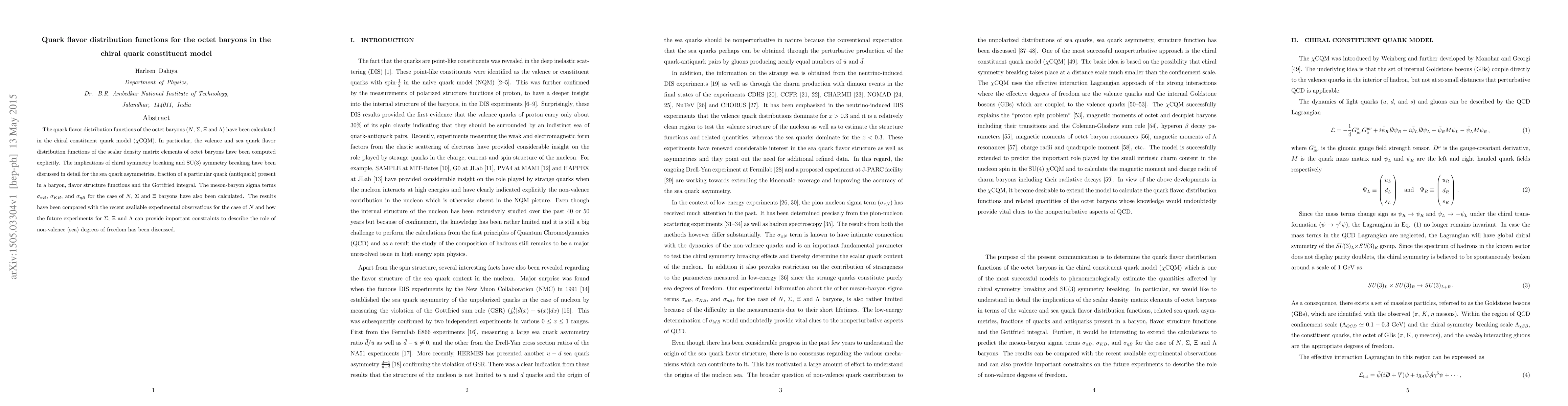 This paper calculates quark flavor distribution functions for octet baryons in the chiral constituent quark model, focusing on valence and sea quarks. It discusses implications of chiral symmetry breaking and SU(3) symmetry for sea quark asymmetries and compares results with experimental data, highlighting future experimental constraints for $\Sigma$, $\Xi$, and $\Lambda$ baryons.