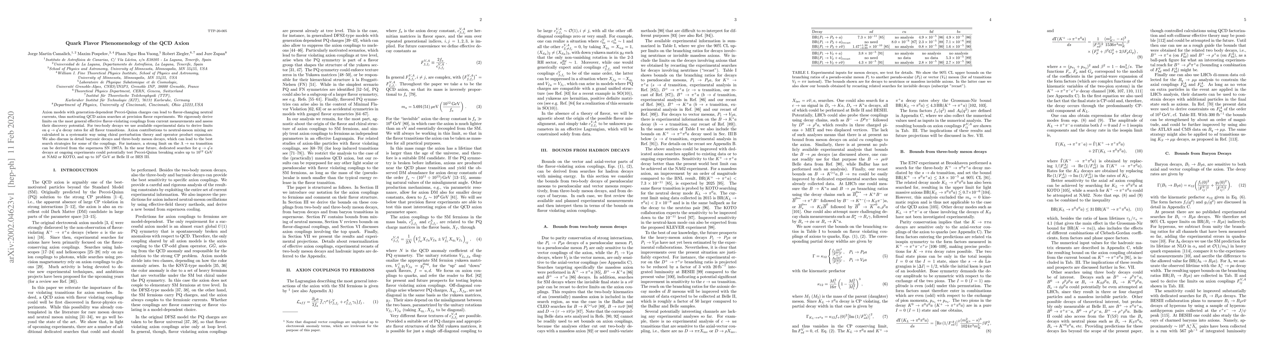 Axion models with generation-dependent Peccei-Quinn charges can lead to flavor-changing neutral currents, thus motivating QCD axion searches at precision flavor experiments. We rigorously derive limits on the most general effective flavor-violating couplings from current measurements and assess their discovery potential. For two-body decays we use available experimental data to derive limits on $q\to q' a$ decay rates for all flavor transitions. Axion contributions to neutral-meson mixing are calculated in a systematic way using chiral perturbation theory and operator product expansion. We also discuss in detail baryonic decays and three-body meson decays, which can lead to the best search strategies for some of the couplings. For instance, a strong limit on the $\Lambda\to n a$ transition can be derived from the supernova SN 1987A. In the near future, dedicated searches for $q\to q' a$ decays at ongoing experiments could potentially test Peccei-Quinn breaking scales up to $10^{12}$ GeV at NA62 or KOTO, and up to $10^{9}$ GeV at Belle II or BES III.