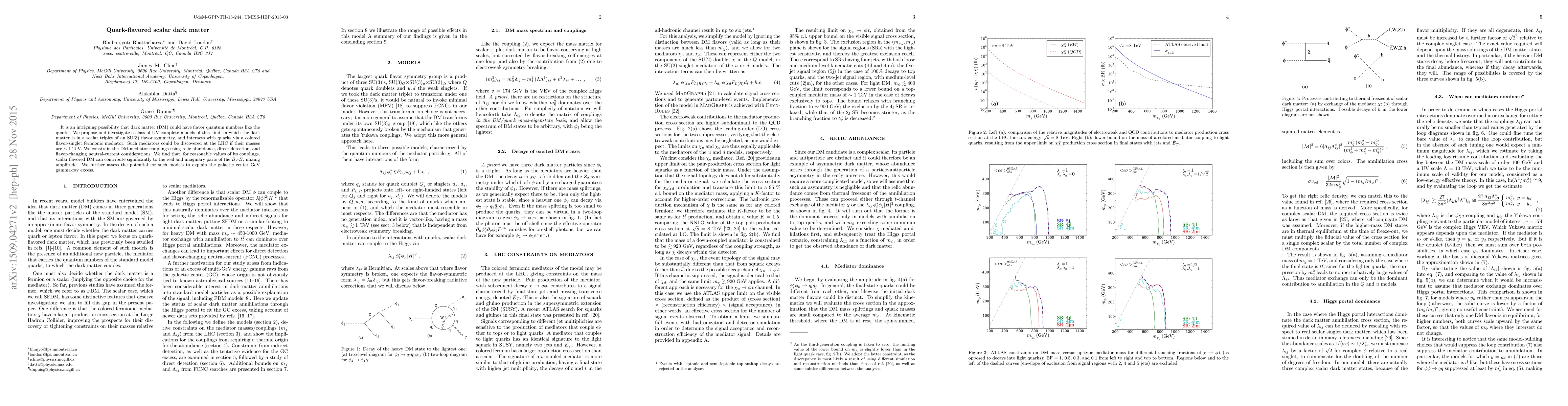 This paper proposes a class of UV-complete models where dark matter is a scalar triplet with quark flavor quantum numbers, mediated by a colored fermionic particle. The study constrains the dark matter-mediator couplings and finds potential contributions to $B_s$-$\bar B_s$ mixing and the galactic center GeV gamma-ray excess.