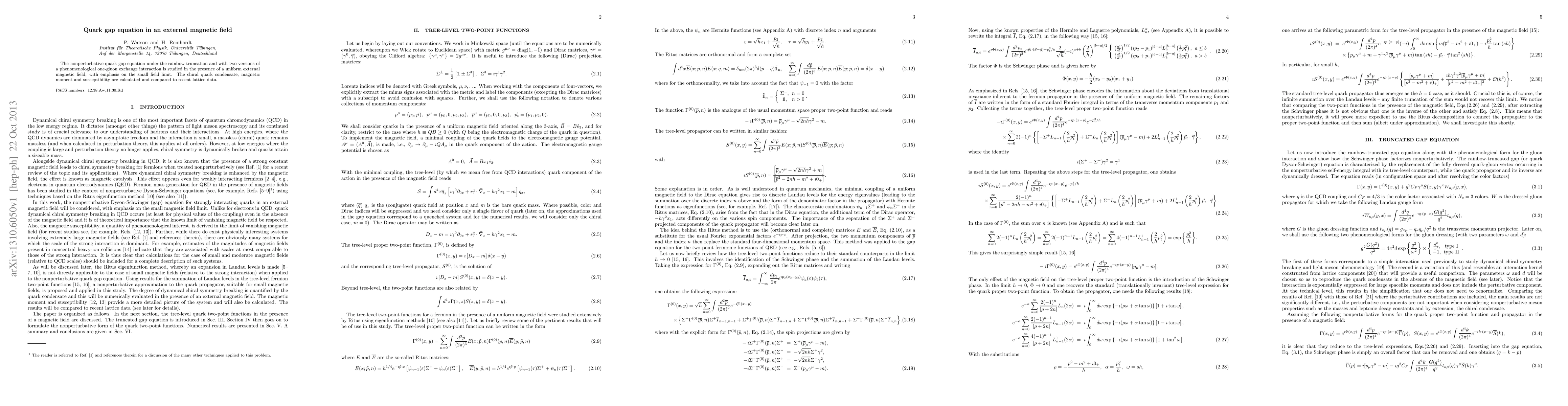 The nonperturbative quark gap equation under the rainbow truncation and with two versions of a phenomenological one-gluon exchange interaction is studied in the presence of a uniform external magnetic field, with emphasis on the small field limit. The chiral quark condensate, magnetic moment and susceptibility are calculated and compared to recent lattice data.