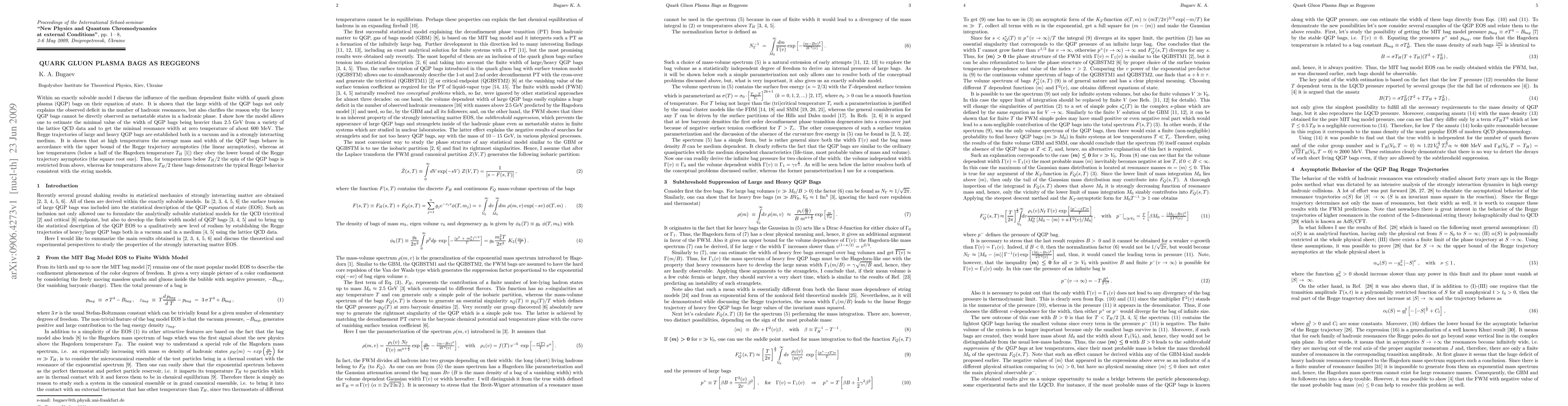 Within an exactly solvable model I discuss the influence of the medium dependent finite width of quark gluon plasma (QGP) bags on their equation of state. It is shown that the large width of the QGP bags not only explains the observed deficit in the number of hadronic resonances, but also clarifies the reason why the heavy QGP bags cannot be directly observed as metastable states in a hadronic phase. I show how the model allows one to estimate the minimal value of the width of QGP bags being heavier than 2.5 GeV from a variety of the lattice QCD data and to get the minimal resonance width at zero temperature of about 600 MeV. The Regge trajectories of large and heavy QGP bags are established both in a vacuum and in a strongly interacting medium. It is shown that at high temperatures the average mass and width of the QGP bags behave in accordance with the upper bound of the Regge trajectory asymptotics (the linear asymptotics), whereas at low temperatures (below a half of the Hagedorn temperature T_H [1] they obey the lower bound of the Regge trajectory asymptotics (the square root one). Thus, for temperatures below T_H/2 the spin of the QGP bags is restricted from above, whereas for temperatures above T_H/2 these bags demonstrate the typical Regge behavior consistent with the string models.