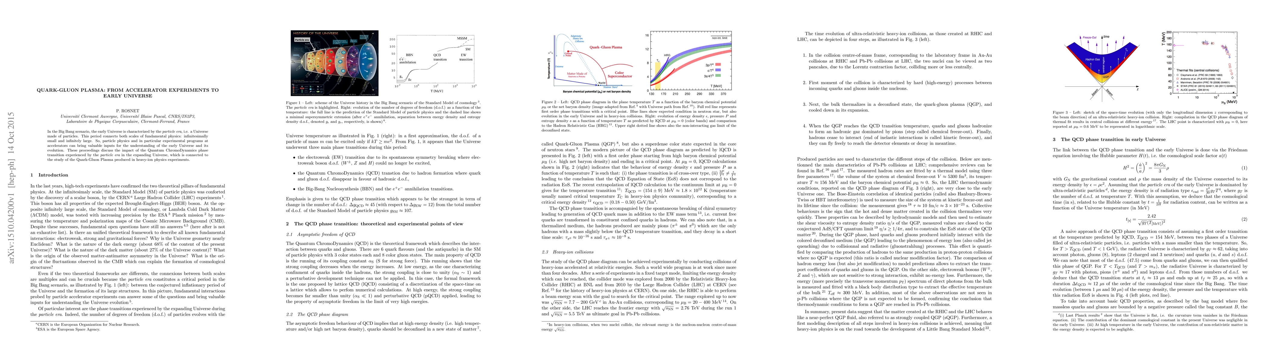 In the Big Bang scenario, the early Universe is characterized by the {\it particle era}, i.e. a Universe made of particles. This period connects both scales of fundamental physics: infinitesimally small and infinitely large. So, particle physics and in particular experimental programs at accelerators can bring valuable inputs for the understanding of the early Universe and its evolution. These proceedings discuss the impact of the Quantum ChromoDynamics phase transition experienced by the {\it particle era} in the expanding Universe, which is connected to the study of the Quark-Gluon Plasma produced in heavy-ion physics experiments.