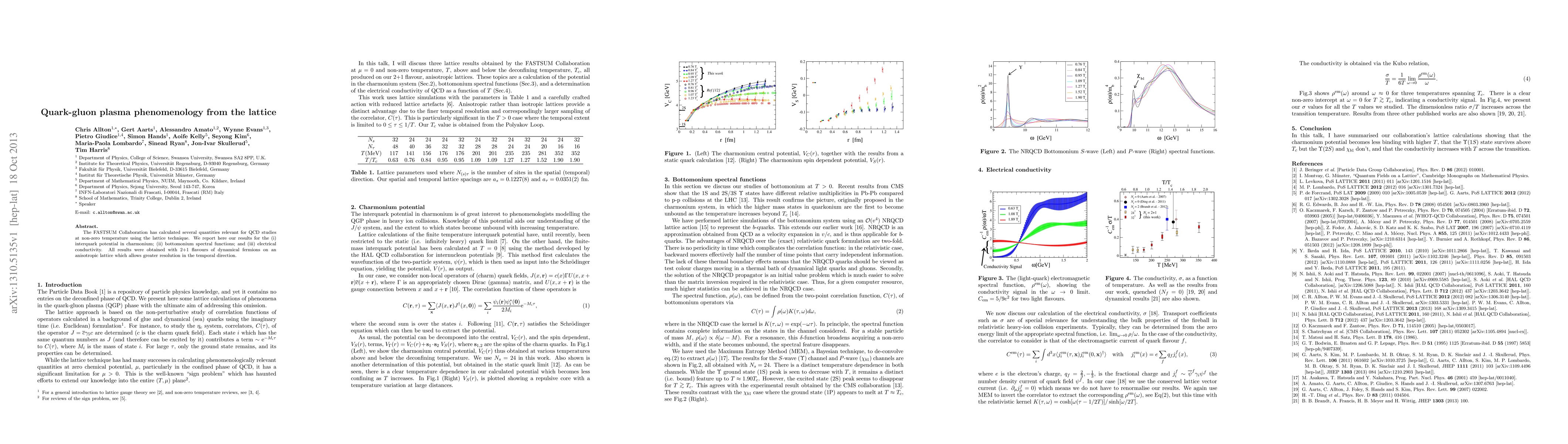 The FASTSUM Collaboration has calculated several quantities relevant for QCD studies at non-zero temperature using the lattice technique. We report here our results for the (i) interquark potential in charmonium; (ii) bottomonium spectral functions; and (iii) electrical conductivity. All results were obtained with 2+1 flavours of dynamical fermions on an anisotropic lattice which allows greater resolution in the temporal direction.
