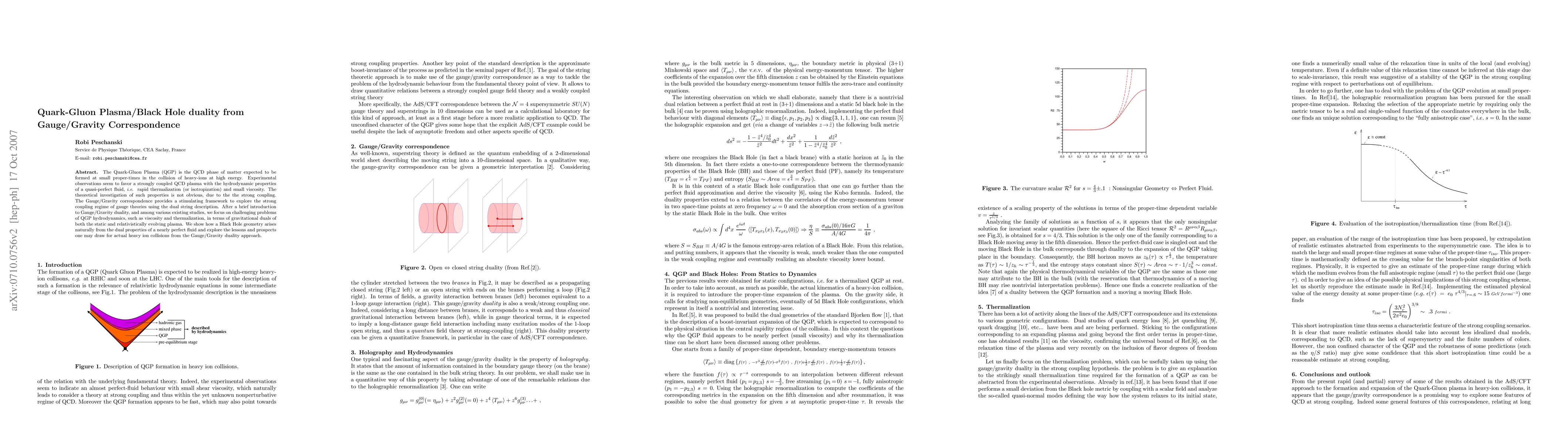 This paper explores the Quark-Gluon Plasma (QGP) through the Gauge/Gravity correspondence, demonstrating how a black hole geometry emerges from the dual description of a strongly coupled, nearly perfect fluid. It investigates QGP hydrodynamic properties like viscosity and thermalization using gravitational duals.