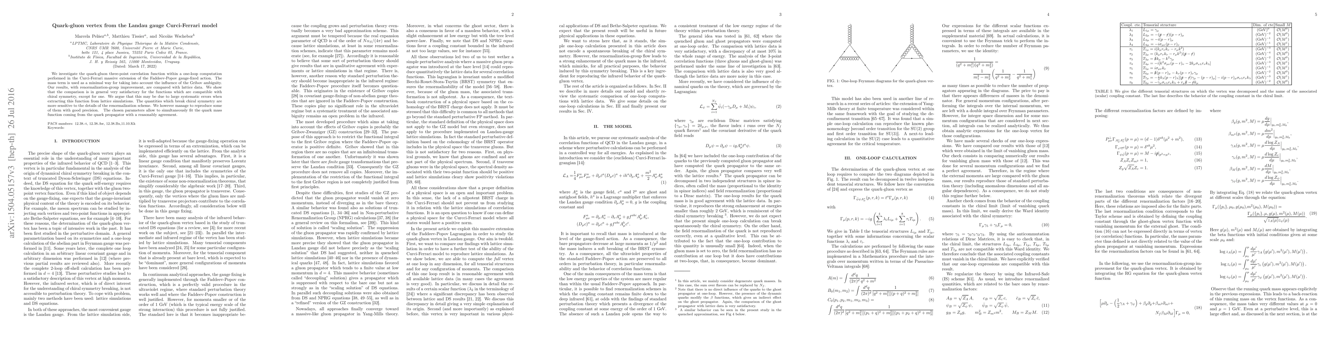 The paper presents a detailed one-loop calculation of the quark-gluon vertex in the Curci-Ferrari model, including renormalization-group improvement and comparison with quenched lattice data.