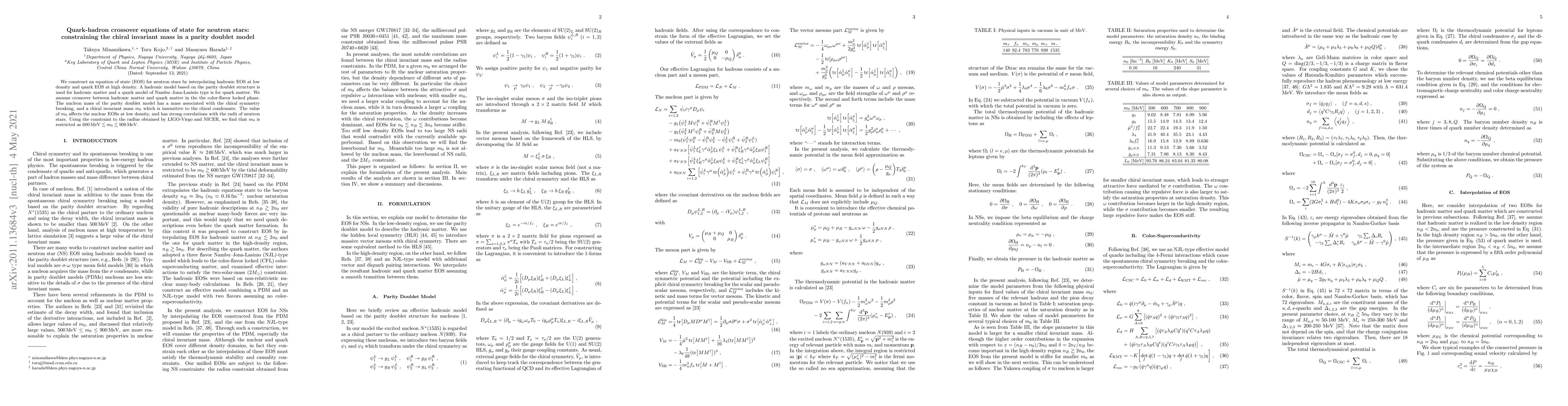 This paper constructs an equation of state for neutron stars by interpolating hadronic and quark matter models, finding that the chiral invariant mass $m_0$ in the parity doublet model constrains the nuclear EOS and neutron star radii. LIGO-Virgo and NICER data restrict $m_0$ to the range $600\,\mathrm{MeV}\lesssim m_0 \lesssim 900\,\mathrm{MeV}$.