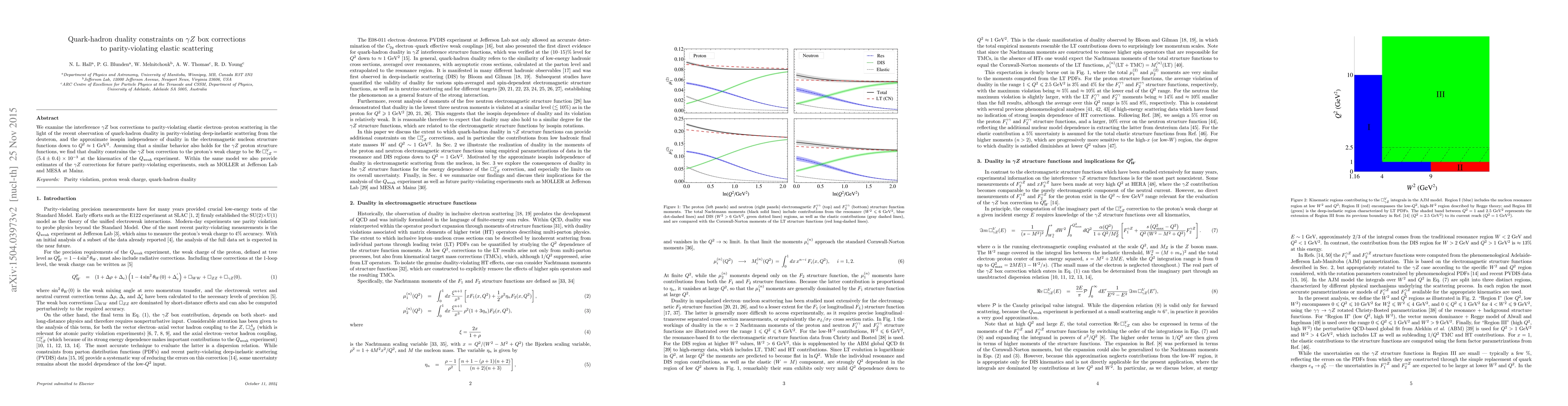This paper explores the impact of quark-hadron duality on \gamma Z box corrections in parity-violating elastic electron-proton scattering, finding that duality constrains the correction to the proton's weak charge to be \Re e\, \square_{\gamma Z}^V = (5.4 \pm 0.4) \times 10^{-3} at the Q_{\text{weak}} kinematics. It also provides estimates for future experiments like MOLLER and MESA.