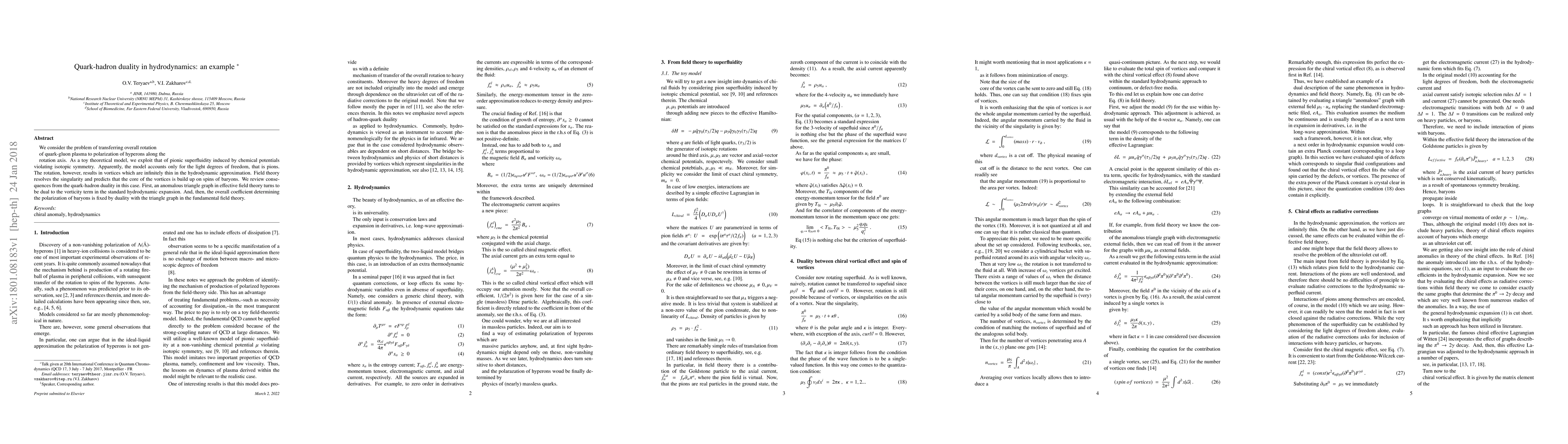 We consider the problem of transferring overall rotation of quark-gluon plasma to polarization of hyperons along the rotation axis. As a toy theoretical model, we exploit that of pionic superfluidity induced by chemical potentials violating isotopic symmetry. Apparently, the model accounts only for the light degrees of freedom, that is pions. The rotation, however, results in vortices which are infinitely thin in the hydrodynamic approximation. Field theory resolves the singularity and predicts that the core of the vortices is build up on spins of baryons. We review consequences from the quark-hadron duality in this case. First, an anomalous triangle graph in effective field theory turns to be dual to the vorticity term in the standard hydrodynamic expansion. And, then, the overall coefficient determining the polarization of baryons is fixed by duality with the triangle graph in the fundamental field theory.