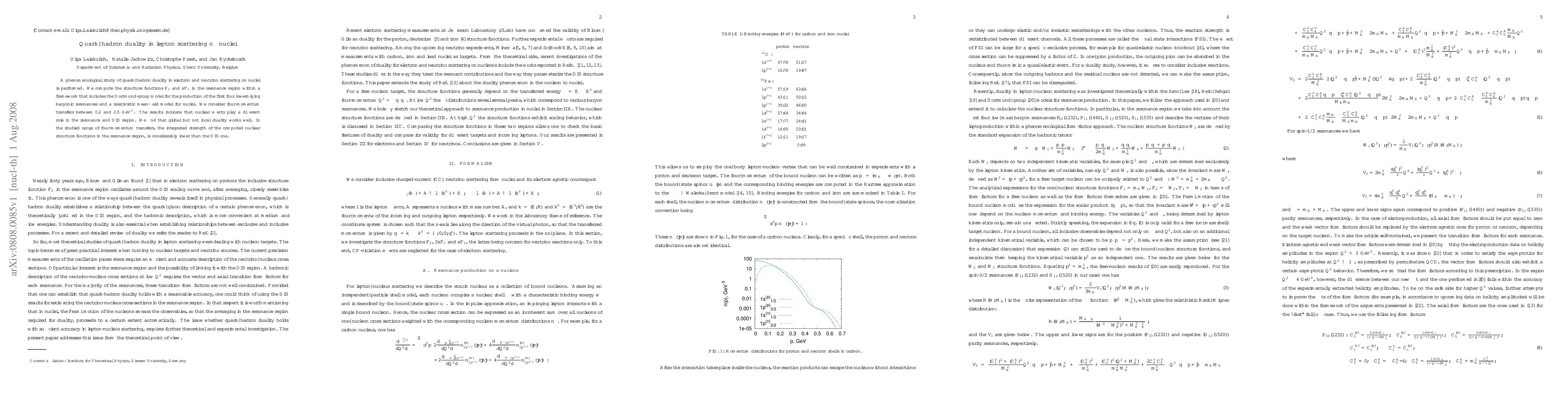 This study investigates quark-hadron duality in electron and neutrino scattering on nuclei, revealing that nuclear effects differ between resonance and DIS regions. The research finds global but not local duality holds, with the integrated strength of nuclear structure functions in the resonance region being significantly lower than in the DIS region.