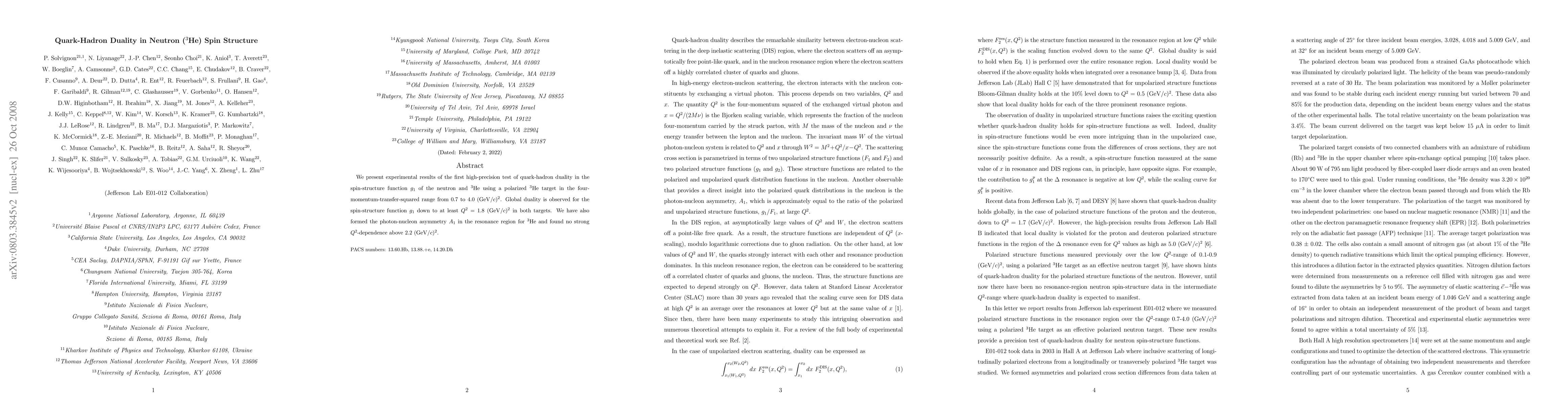 We present experimental results of the first high-precision test of quark-hadron duality in the spin-structure function g_1 of the neutron and $^3$He using a polarized 3He target in the four-momentum-transfer-squared range from 0.7 to 4.0 (GeV/c)^2. Global duality is observed for the spin-structure function g_1 down to at least Q^2 = 1.8 (GeV/c)^2 in both targets. We have also formed the photon-nucleon asymmetry A_1 in the resonance region for 3He and found no strong Q^2-dependence above 2.2 (GeV/c)^2.
