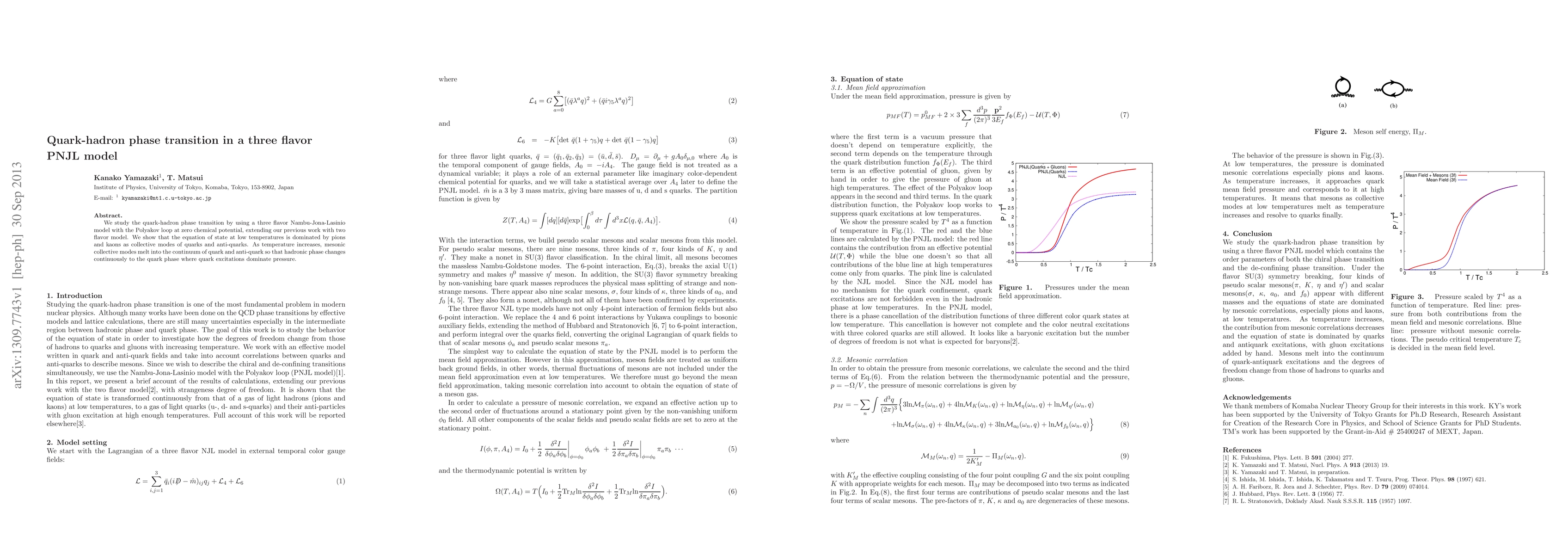 This paper investigates the quark-hadron phase transition using a three-flavor PNJL model, revealing that pions and kaons dominate the low-temperature equation of state. As temperature rises, mesonic modes transition into a quark-gluon continuum, leading to a continuous shift from hadronic to quark phases.