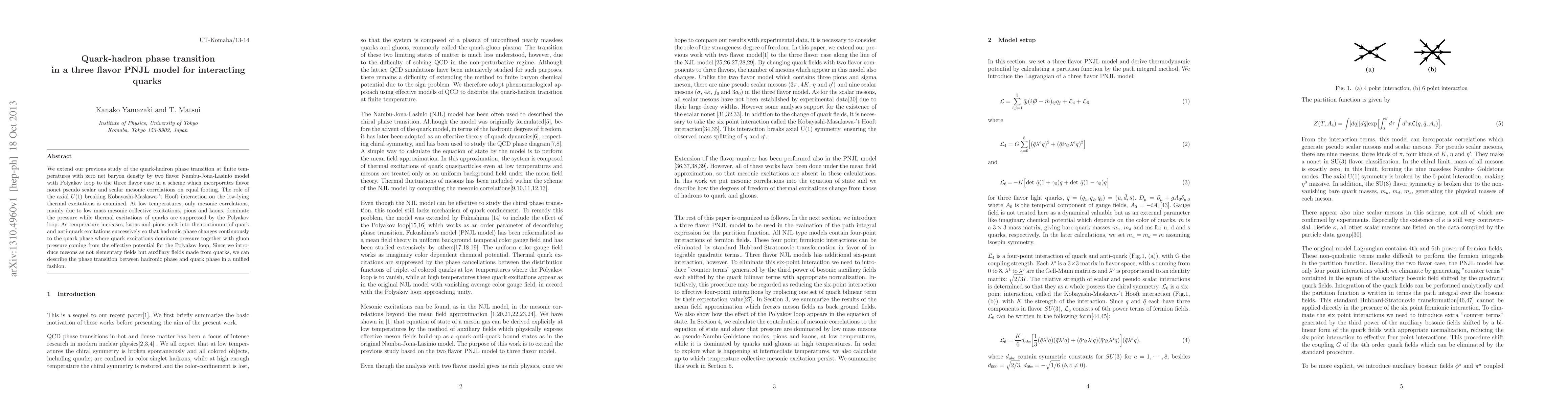 This paper investigates the quark-hadron phase transition in a three-flavor PNJL model, extending previous studies on two-flavor systems. It examines how mesonic correlations and the axial U(1) breaking influence the transition, showing that at low temperatures mesonic excitations dominate, while at higher temperatures quarks and gluons take over.