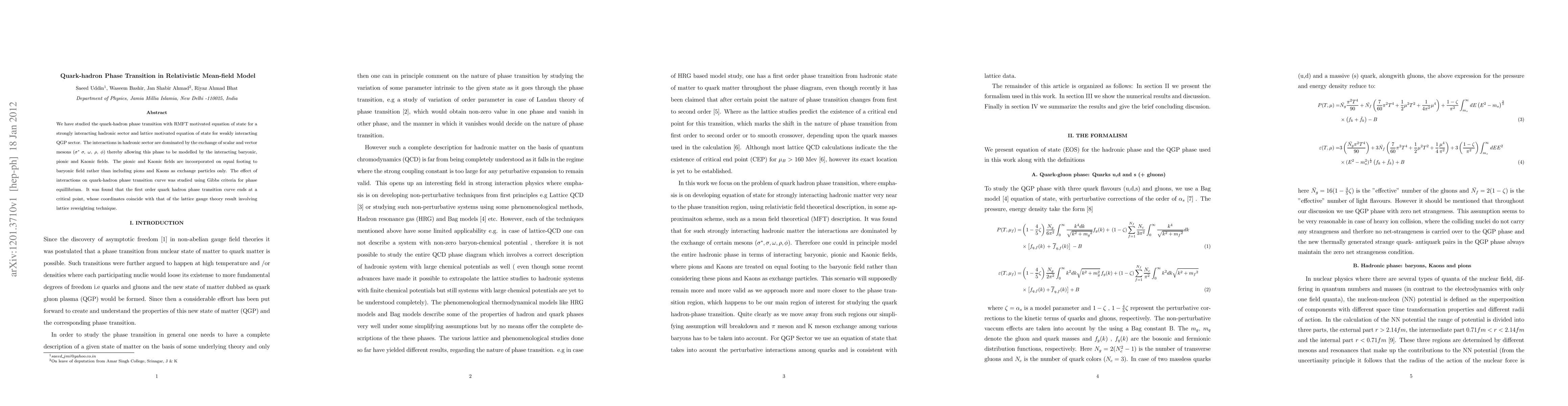 This paper investigates the quark-hadron phase transition using the Relativistic Mean-field Theory (RMFT) and compares it to lattice QCD results. It finds that the transition ends at a critical point, aligning with lattice gauge theory findings.
