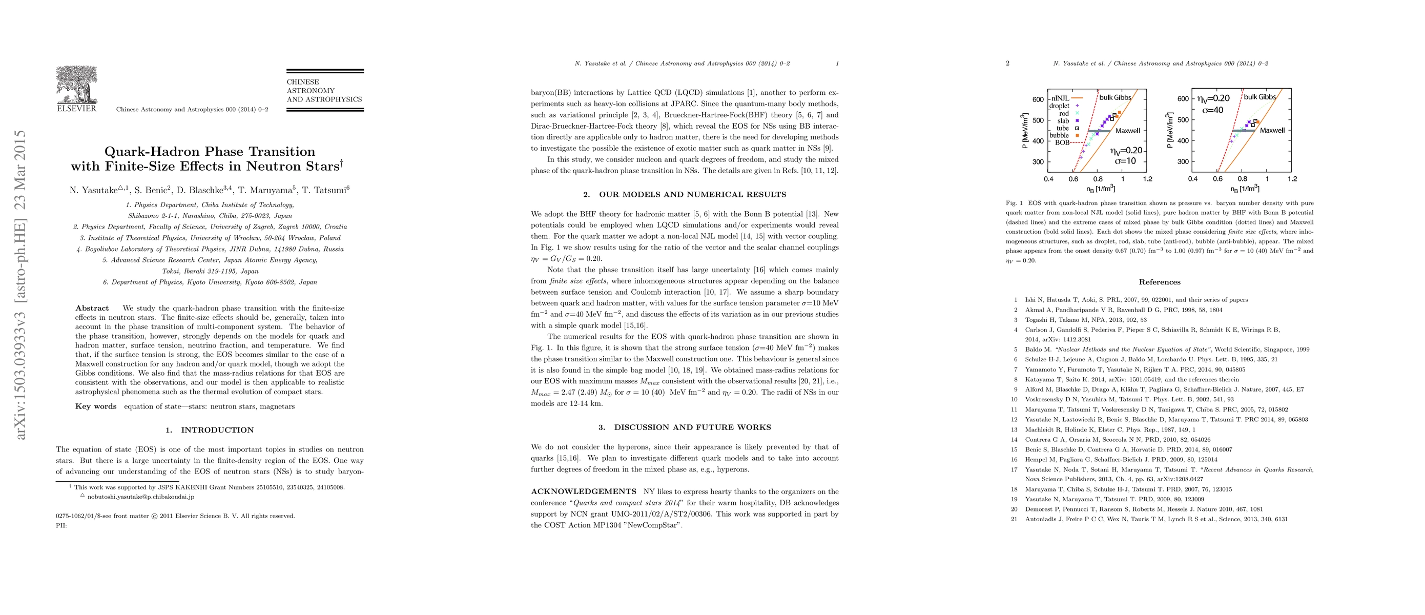 This research investigates the quark-hadron phase transition in neutron stars, emphasizing the importance of finite-size effects. The study finds that strong surface tension leads to an EOS resembling a Maxwell construction, consistent with observed mass-radius relations for neutron stars, thus applicable to astrophysical phenomena like the thermal evolution of compact stars.