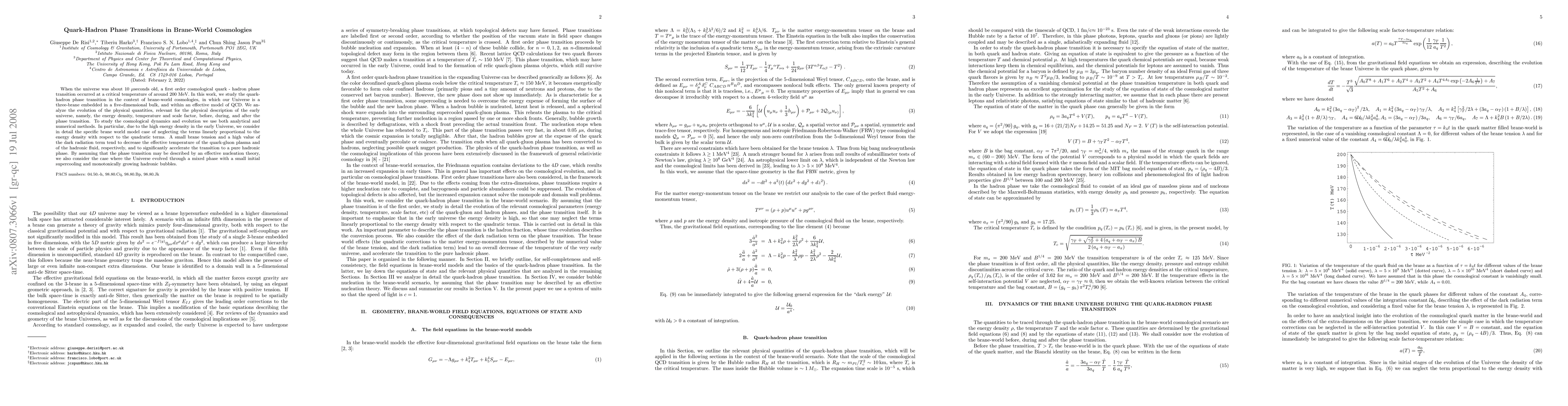 This paper investigates the quark-hadron phase transition in the early universe within brane-world cosmologies, using both analytical and numerical methods to analyze the energy density, temperature, and scale factor. The study finds that a small brane tension and high dark radiation accelerate the transition to a hadronic phase.
