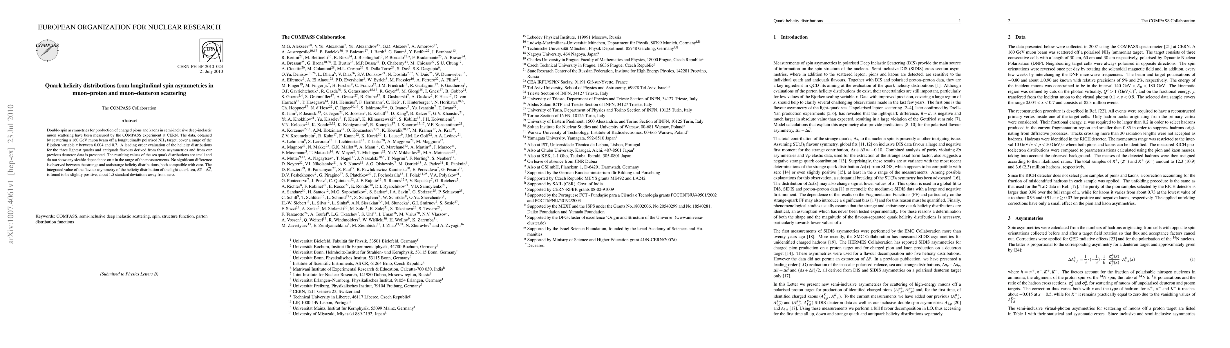 Double-spin asymmetries for production of charged pions and kaons in semi-inclusive deep-inelastic muon scattering have been measured by the COMPASS experiment at CERN. The data, obtained by scattering a 160 GeV muon beam off a longitudinally polarised NH_3 target, cover a range of the Bjorken variable x between 0.004 and 0.7. A leading order evaluation of the helicity distributions for the three lightest quarks and antiquark flavours derived from these asymmetries and from our previous deuteron data is presented. The resulting values of the sea quark distributions are small and do not show any sizable dependence on x in the range of the measurements. No significant difference is observed between the strange and antistrange helicity distributions, both compatible with zero. The integrated value of the flavour asymmetry of the helicity distribution of the light-quark sea, \Delta u-bar - \Delta d-bar, is found to be slightly positive, about 1.5 standard deviations away from zero.