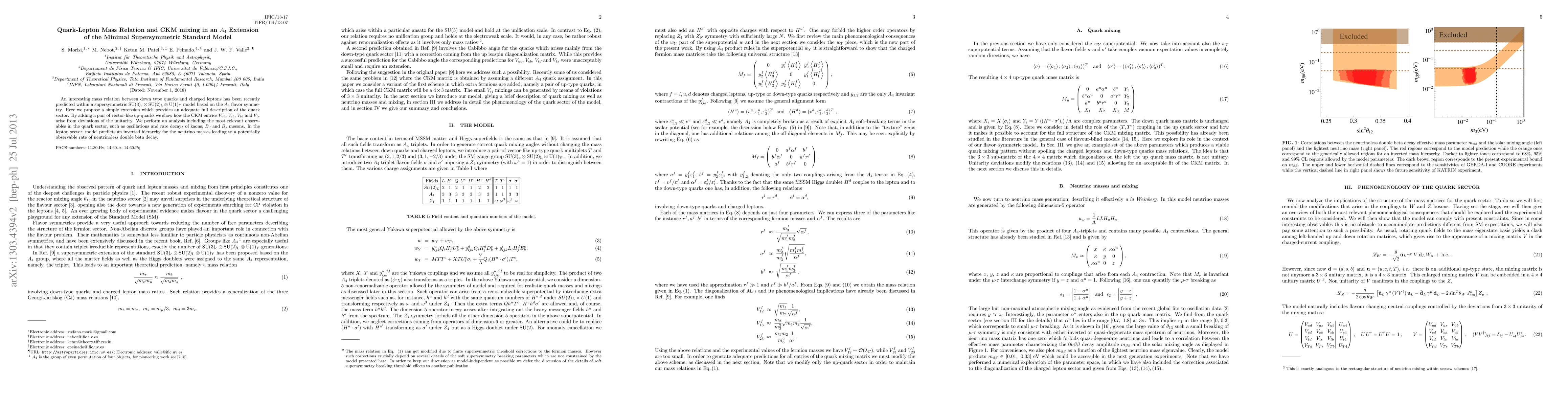 An interesting mass relation between down type quarks and charged leptons has been recently predicted within a supersymmetric SU(3)_c \times SU(2)_L \times U(1)_Y model based on the A4 flavor symmetry. Here we propose a simple extension which provides an adequate full description of the quark sector. By adding a pair of vector-like up-quarks we show how the CKM entries Vub, Vcb, Vtd and Vts arise from deviations of the unitarity. We perform an analysis including the most relevant observables in the quark sector, such as oscillations and rare decays of Kaons, Bd and Bs mesons. In the lepton sector, model predicts an inverted hierarchy for the neutrino masses leading to a potentially observable rate of neutrinoless double beta decay.