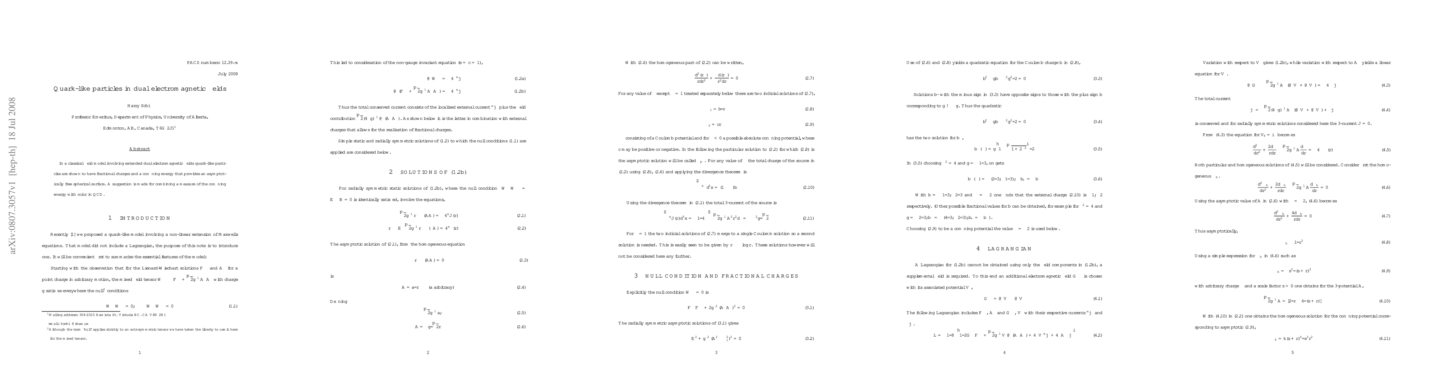 Summary: This paper explores quark-like particles in extended dual electromagnetic fields, demonstrating they possess fractional charges and a confining energy that forms an asymptotically free spherical surface. It proposes integrating confining energy measures with color in Quantum Chromodynamics (QCD).