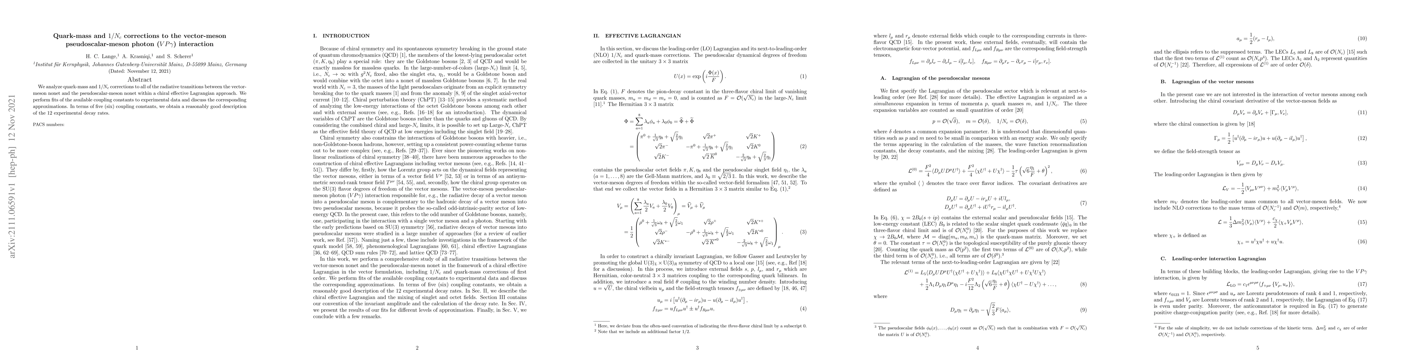 This paper investigates quark-mass and $1/N_c$ corrections to vector-meson and pseudoscalar-meson interactions within a chiral effective Lagrangian framework. It fits coupling constants to experimental decay rates and achieves a good description of 12 experimental values using five (six) coupling constants.