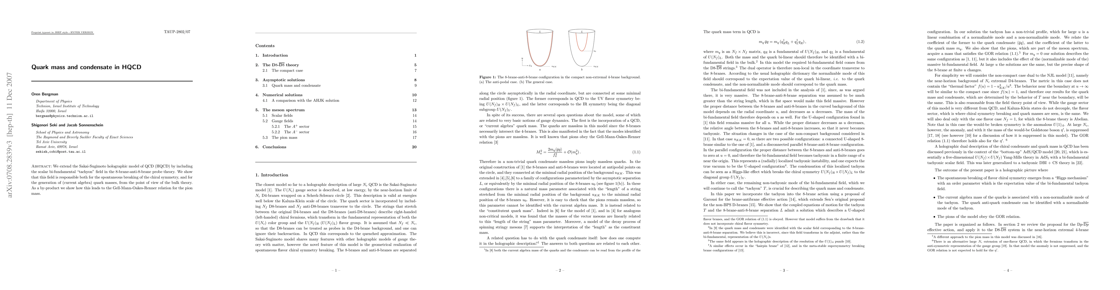 We extend the Sakai-Sugimoto holographic model of QCD (HQCD) by including the scalar bi-fundamental "tachyon" field in the 8-brane-anti-8-brane probe theory. We show that this field is responsible both for the spontaneous breaking of the chiral symmetry, and for the generation of (current algebra) quark masses, from the point of view of the bulk theory. As a by-product we show how this leads to the Gell-Mann- Oakes-Renner relation for the pion mass.