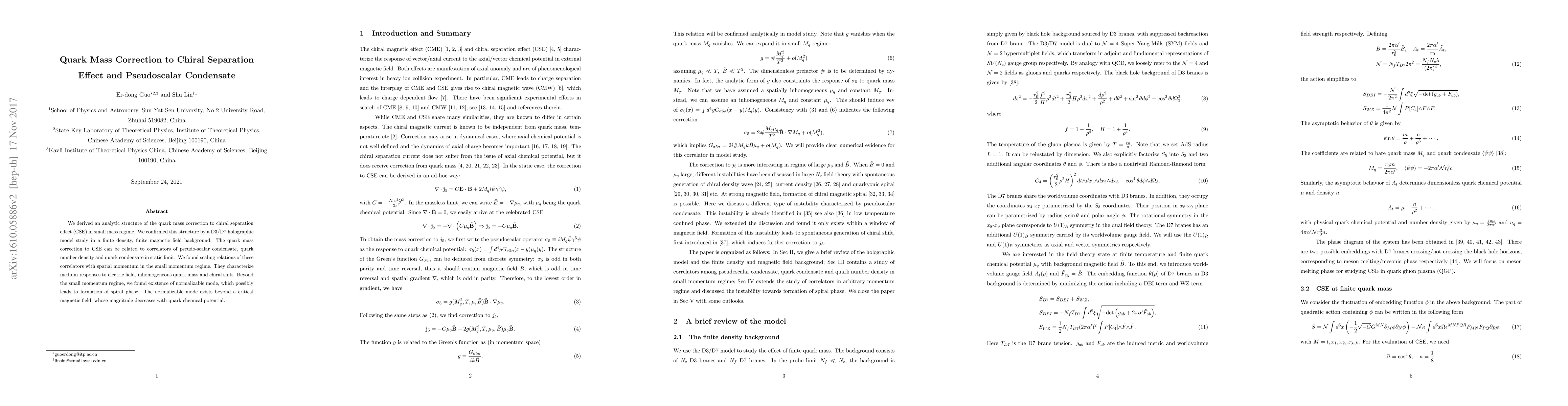 This paper derives an analytic structure for the quark mass correction to the chiral separation effect (CSE) in a small mass regime and confirms it using a D3/D7 holographic model. It finds scaling relations for correlators of pseudoscalar condensate, quark number density, and quark condensate in the static limit, characterizing medium responses to various fields. It also identifies a normalizable mode beyond a critical magnetic field, potentially leading to spiral phase formation.