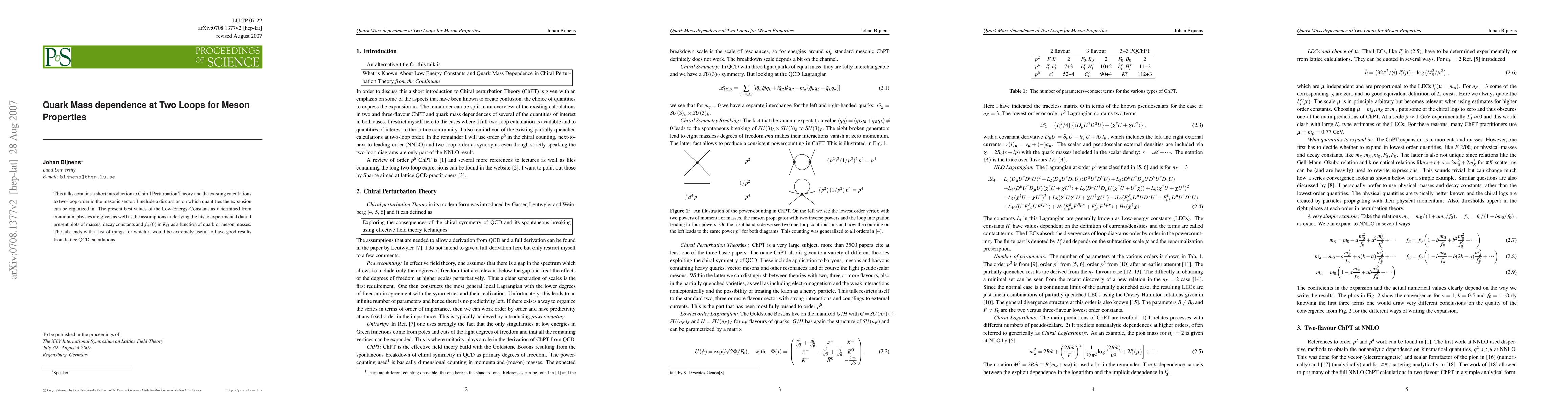 This talks contains a short introduction to Chiral Perturbation Theory and the existing calculations to two-loop order in the mesonic sector. I include a discussion on which quantities the expansion can be organized in. The present best values of the Low-Energy-Constants as determined from continuum physics are given as well as the assumptions underlying the fits to experimental data. I present plots of masses, decay constants and $f_+(0)$ in $K_{\ell3}$ as a function of quark or meson masses. The talk ends with a list of things for which it would be extremely useful to have good results from lattice QCD calculations.
