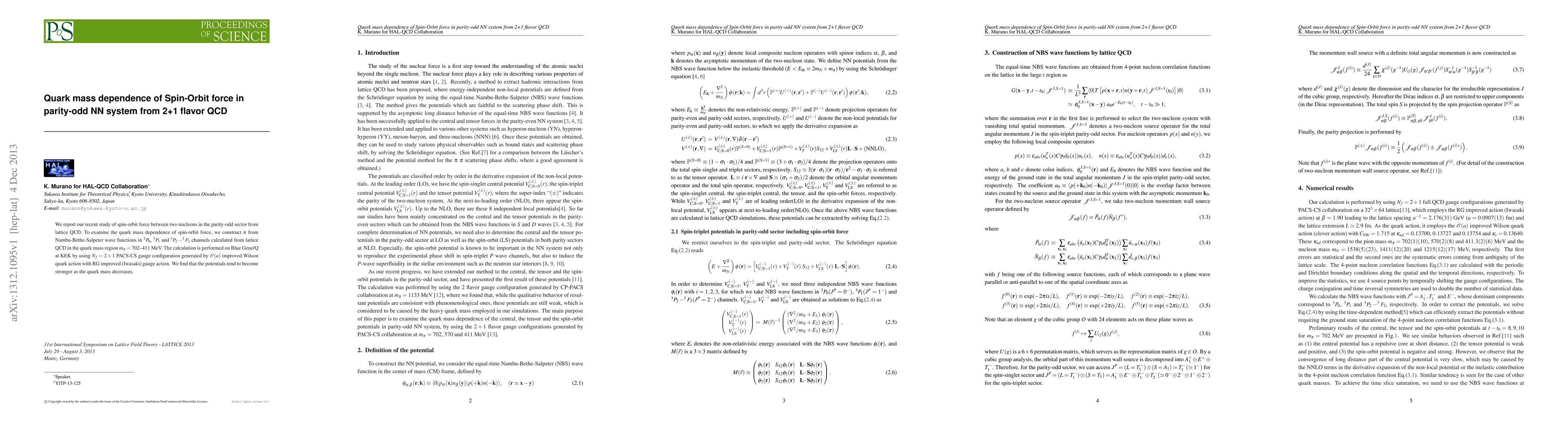 We report our recent study of spin-orbit force between two nucleons in the parity-odd sector from lattice QCD. To examine the quark mass dependence of spin-orbit force, we construct it from Nambu-Bethe-Salpeter wave functions in $^3P_0$, $^3P_1$ and $^3P_2-^3F_2$ channels calculated from lattice QCD in the quark mass region $m_\pi$=702-411 MeV. The calculation is performed on Blue Gene/Q at KEK by using $N_f=2+1$ PACS-CS gauge configuration generated by O(a) improved Wilson quark action with RG improved (Iwasaki) gauge action. We find that the potentials tend to become stronger as the quark mass decreases.