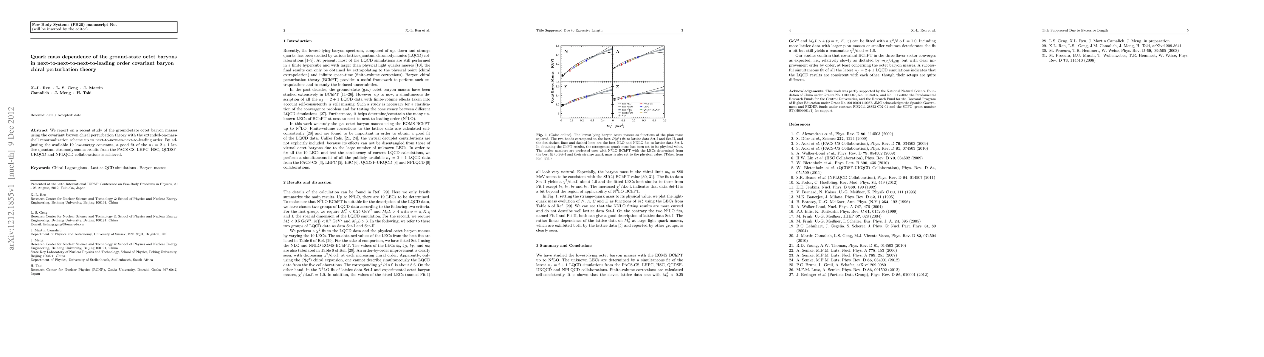 This study investigates the mass dependence of ground-state octet baryons using next-to-next-to-next-to-leading order covariant baryon chiral perturbation theory, achieving a good fit to lattice QCD results by adjusting 19 low-energy constants. The extended-on-mass-shell renormalization scheme is employed for precision.