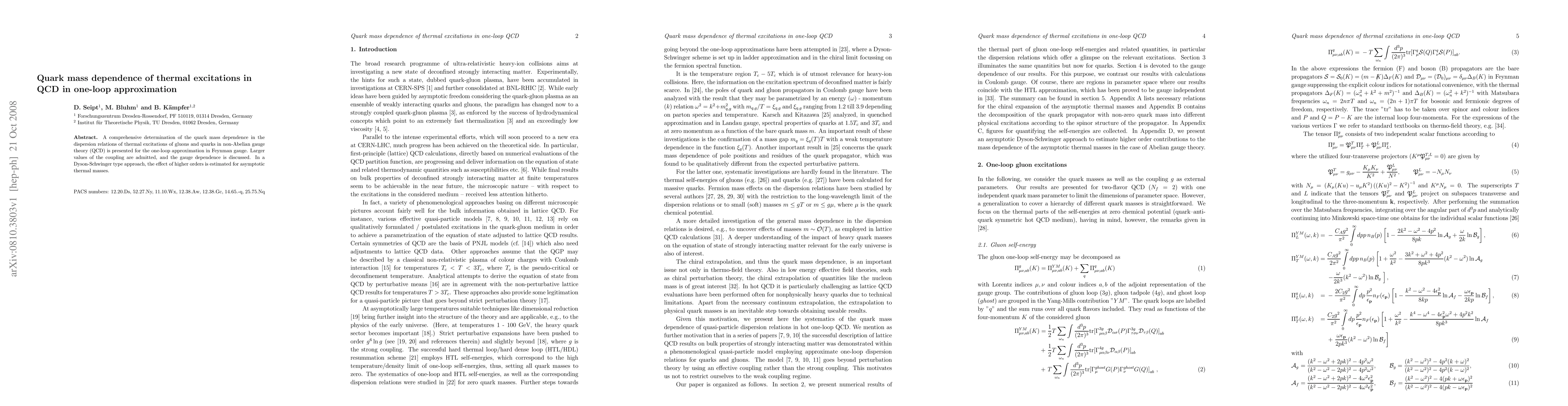 A comprehensive determination of the quark mass dependence in the dispersion relations of thermal excitations of gluons and quarks in non-Abelian gauge theory (QCD) is presented for the one-loop approximation in Feynman gauge. Larger values of the coupling are admitted, and the gauge dependence is discussed. In a Dyson-Schwinger type approach, the effect of higher orders is estimated for asymptotic thermal masses.