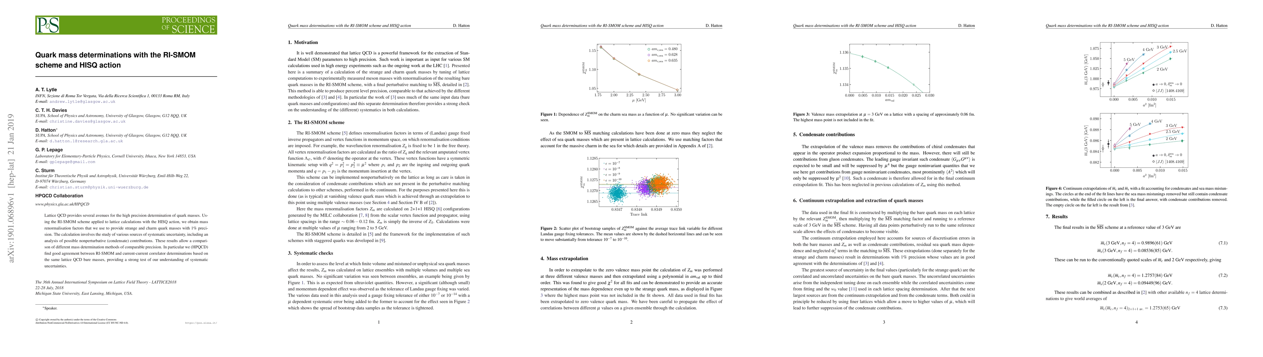 Lattice QCD provides several avenues for the high precision determination of quark masses. Using the RI-SMOM scheme applied to lattice calculations with the HISQ action, we obtain mass renormalisation factors that we use to provide strange and charm quark masses with 1% precision. The calculation involves the study of various sources of systematic uncertainty, including an analysis of possible nonperturbative (condensate) contributions. These results allow a comparison of different mass determination methods of comparable precision. In particular we (HPQCD) find good agreement between RI-SMOM and current-current correlator determinations based on the same lattice QCD bare masses, providing a strong test of our understanding of systematic uncertainties.