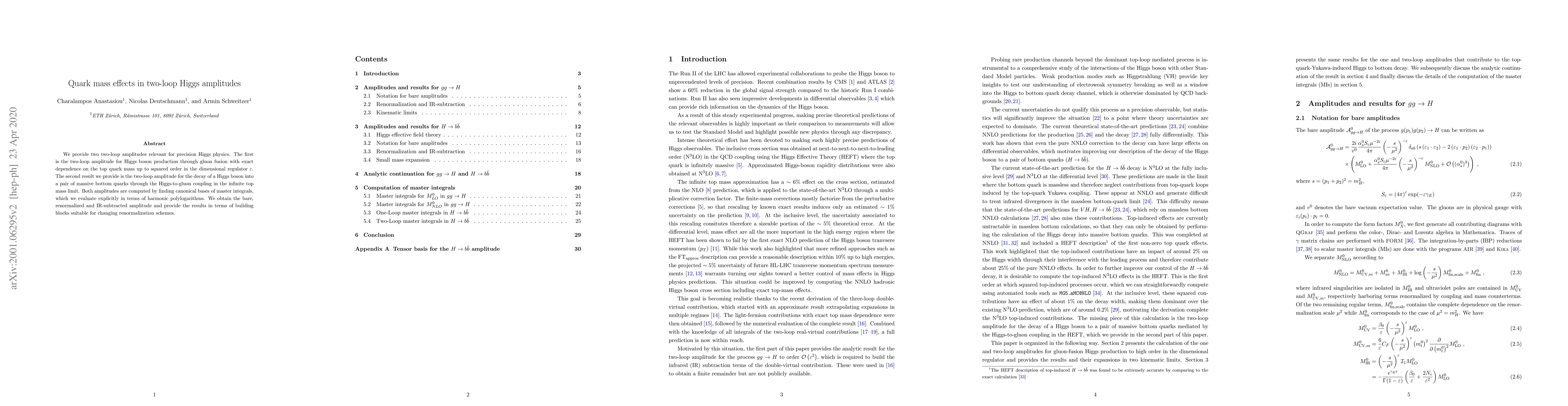 This paper computes two two-loop amplitudes crucial for precision Higgs physics: one for Higgs boson production via gluon fusion with top quark mass dependence, and another for Higgs decay into bottom quarks through the Higgs-to-gluon coupling. Both results are derived using master integrals evaluated in terms of harmonic polylogarithms.