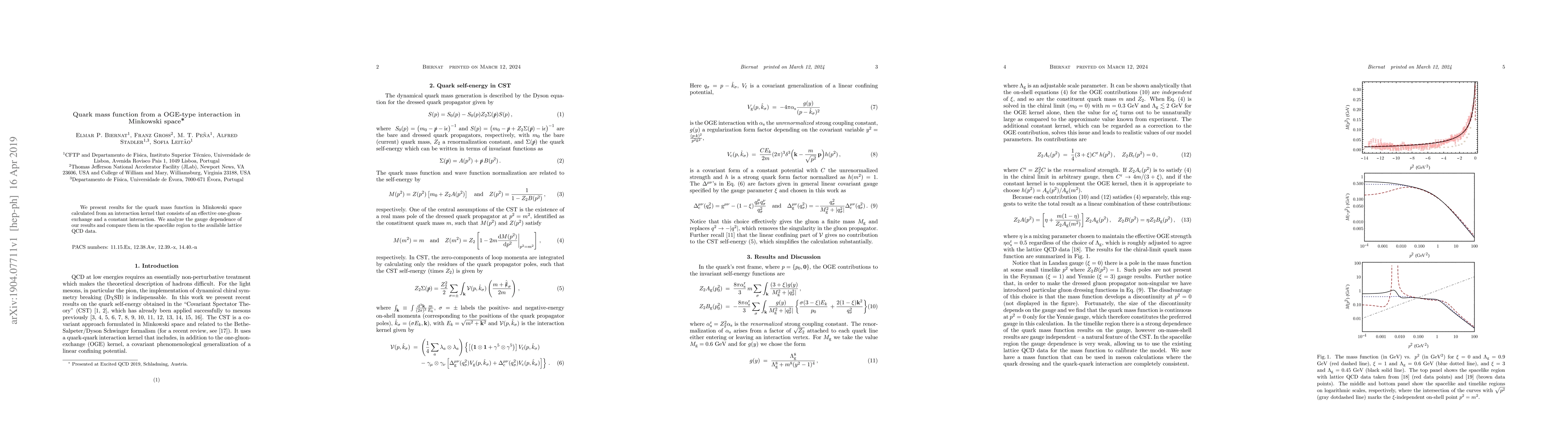 Researchers calculate quark mass function in Minkowski space using an effective one-gluon-exchange interaction, analyzing gauge dependence and comparing to lattice QCD data.