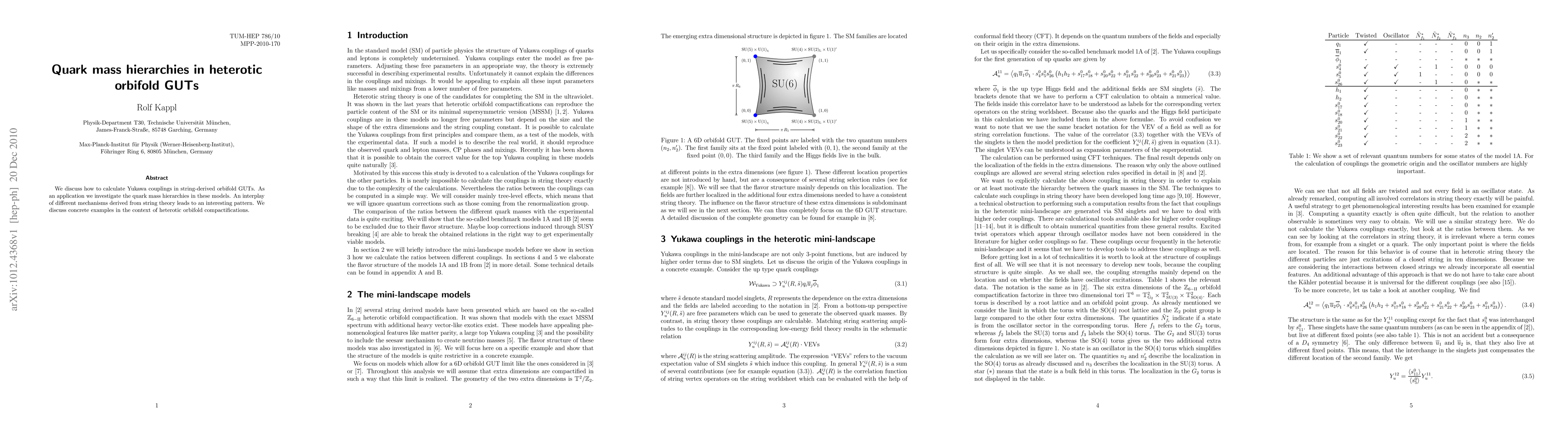 This paper explores the calculation of Yukawa couplings in heterotic orbifold Grand Unified Theories (GUTs) derived from string theory, focusing on how these couplings generate quark mass hierarchies. It highlights the unique patterns emerging from the interplay of various string theory mechanisms within specific compactification models.