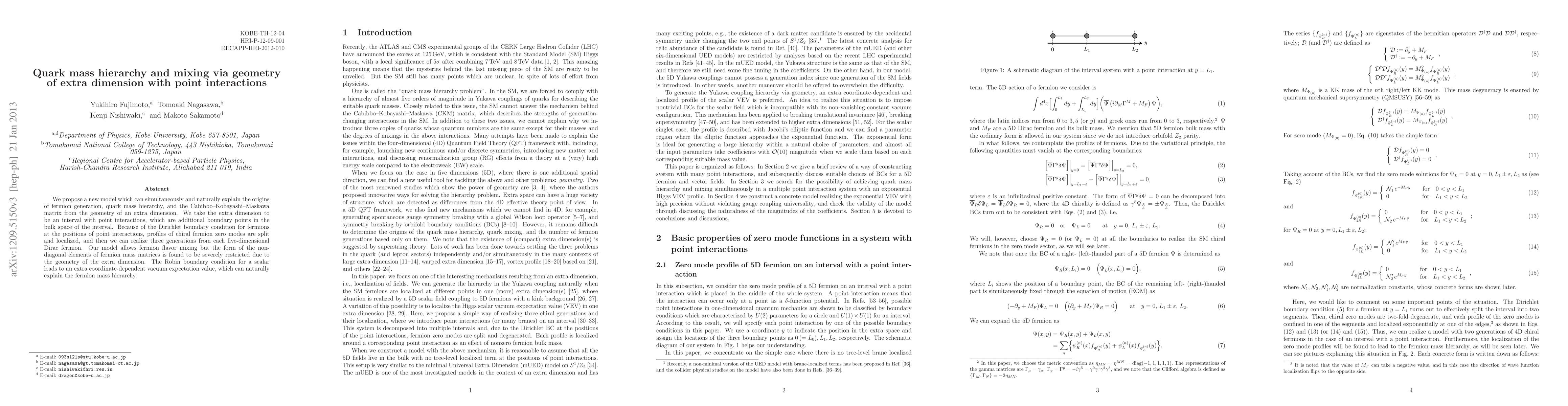 This paper proposes a model explaining fermion generations, quark mass hierarchy, and flavor mixing through the geometry of an extra dimensional interval with point interactions. The model localizes chiral fermion zero modes via Dirichlet boundary conditions, leading to three generations, while the Robin boundary condition for a scalar generates a coordinate-dependent vacuum expectation value that explains the mass hierarchy.