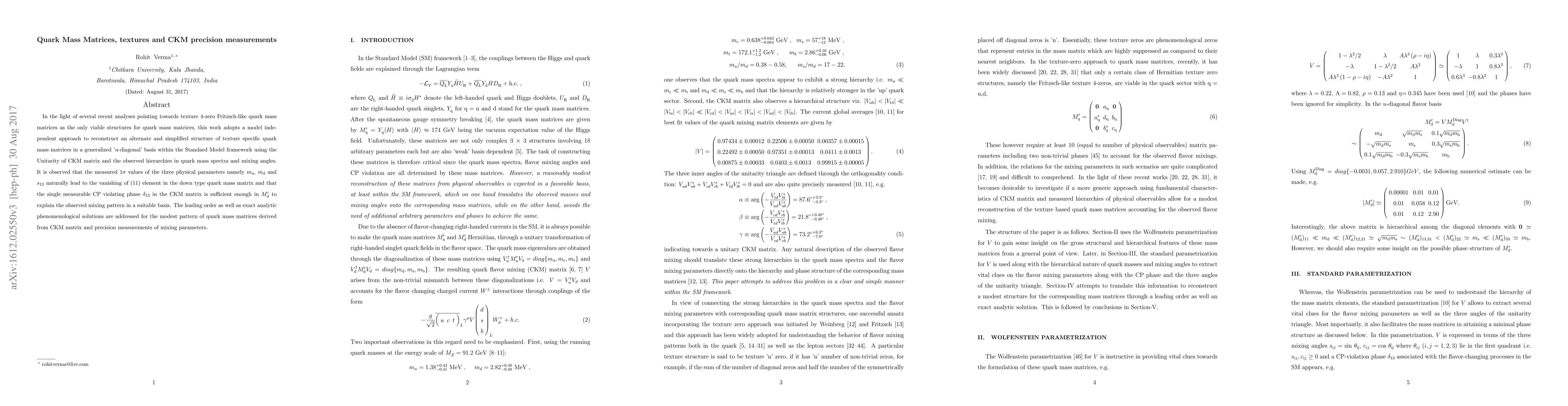 In the light of several recent analyses pointing towards texture 4-zero Fritzsch-like quark mass matrices as the only viable structures for quark mass matrices, this work adopts a model independent approach to reconstruct an alternate and simplified structure of texture specific quark mass matrices in a generalized 'u-diagonal' basis within the Standard Model framework using the Unitarity of CKM matrix and the observed hierarchies in quark mass spectra and mixing angles. It is observed that the measured 1$\sigma$ values of the three physical parameters namely $m_{\rm{u}}$, $m_{\rm{d}}$ and $s_{12}$ naturally lead to the vanishing of (11) element in the down type quark mass matrix and that the single measurable CP violating phase $\delta_{13}$ in the CKM matrix is sufficient enough in $M^{\prime}_{\rm{d}}$ to explain the observed mixing pattern in a suitable basis. The leading order as well as exact analytic phenomenological solutions are addressed for the modest pattern of quark mass matrices derived from CKM matrix and precision measurements of mixing parameters.
