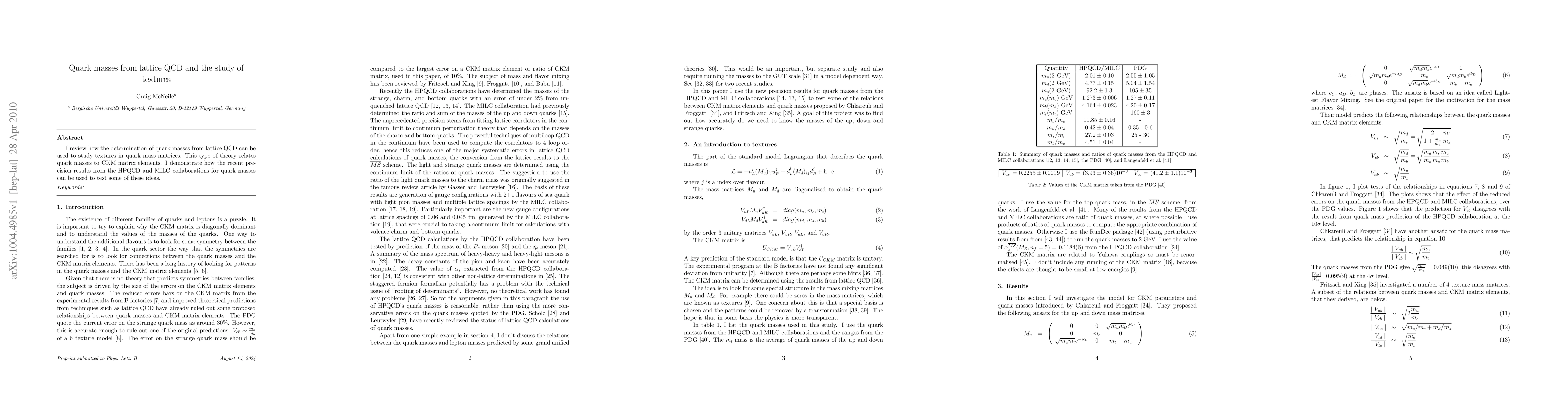 This paper reviews the determination of quark masses from lattice QCD and its application in studying quark mass matrix textures, which relate quark masses to CKM matrix elements. It highlights recent precision results from the HPQCD and MILC collaborations to test these theoretical ideas.